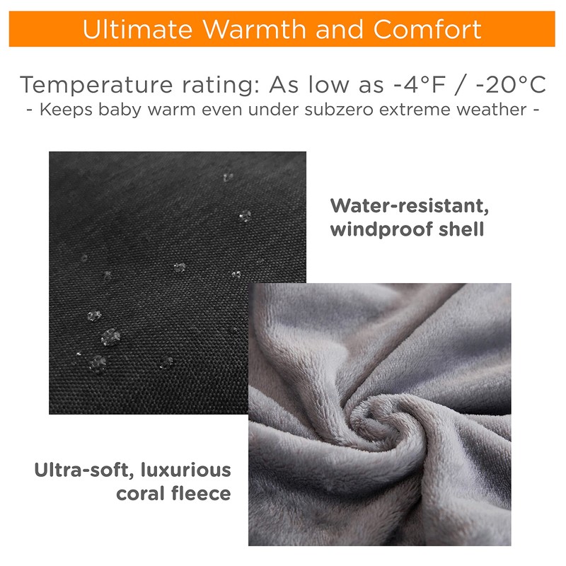 - 【 PROTECTS BABY IN EXTREME WEATHER CONDITIONS 】Temperature rating of -4°F / -20°C. liuliuby’s high quality, water-resistant and windproof shell protects against rain, snow, and wind while the ultra-soft, luxurious coral fleece lining cocoons baby for ultimate warmth and comfort