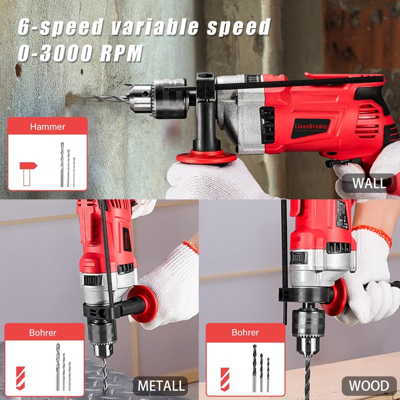 - Robust 900W Pure Copper Motor: Experience high-performance drilling with a 900W pure copper motor, delivering speeds of 0-3000rpm (adjustable) and a hammering frequency of 0-48,000bpm. Engineered for precision drilling and screw driving in concrete, masonry, metal, wood, and composite materials.