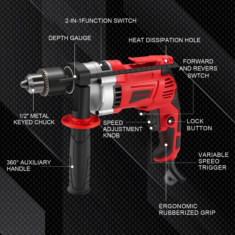- Ergonomic 360° Handle & 13mm Metal Chuck: Operate with stability using the rotatable auxiliary handle, designed for comfort and reduced fatigue. The durable 13mm metal chuck securely accommodates diverse drill bits.