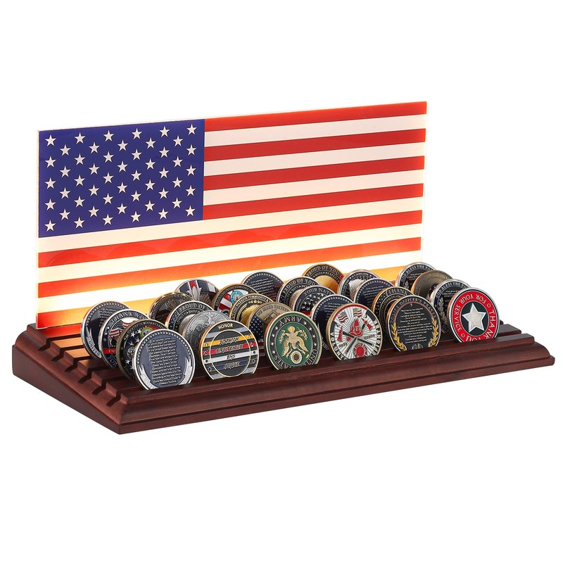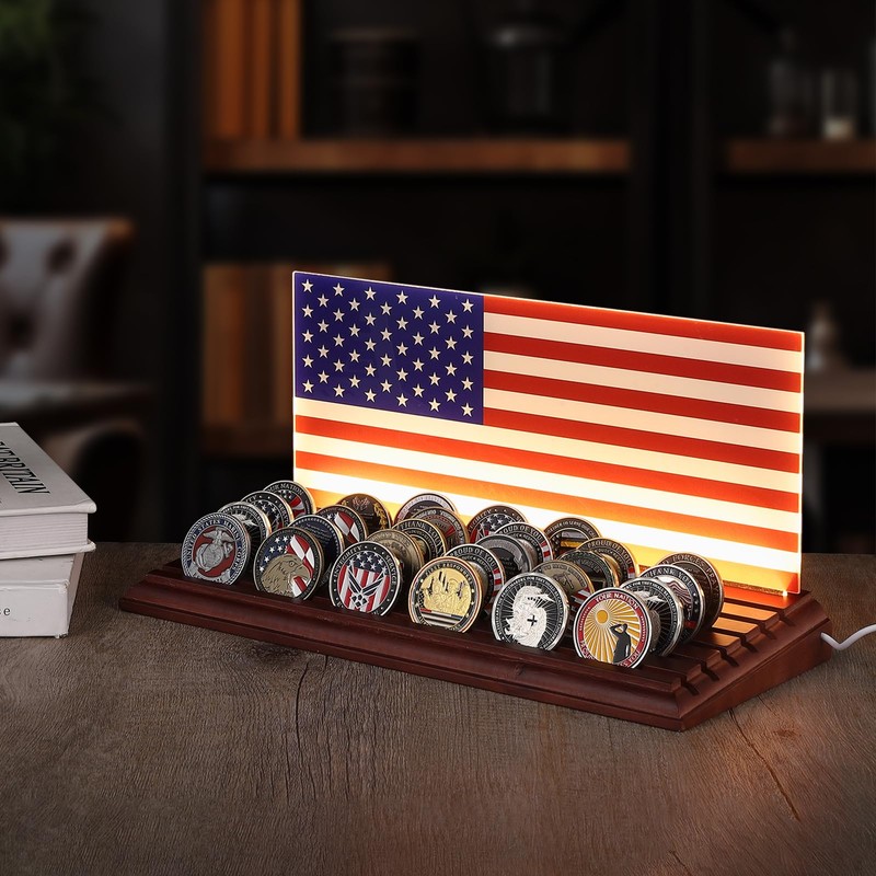 - Intertwined light: Our challenge coin display rack is specially paired with an acrylic panel featuring an engraved American flag design. It comes equipped with warm lighting that not only enhances the aesthetics but also creates an inviting ambiance, making it a perfect addition to any room. Under this warm glow, the patterns and colors of each challenge coin come to life, inviting you to explore their beauty.