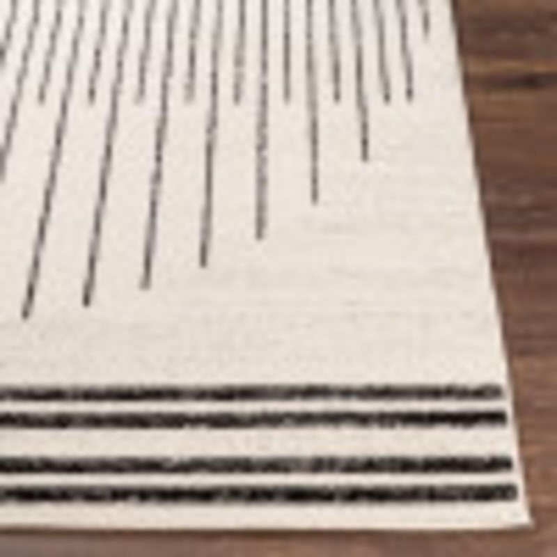 100% PolypropyleneMachine Woven in TurkeyMedium PileThickness: 0.433"Outdoor Safe: NoColors: Black, Ivory, Medium Gray, Light GrayRecommended Rooms: Living Room, Bedroom, Dining Room, Kitchen, Hallway, Foyer, Playroom, Kids RoomDyes, yarns and packing materials all have natural odors that are sometimes magnified after rugs are packaged. Any odors should dissipate within a week of being removed from the packaging. If your rug has a crease, we recommend laying flat or reverse rolling. Creases will disappear within 2 weeks.The compelling rugs from the Penrod Collection feature neutral colorways in striking modern prints. The machine woven construction of these pieces provides durability at a comfortable price point. Made with polypropylene in Turkey with a soft medium pile. Easy to clean and maintain, we recommend vacuuming regularly and spot cleaning with a clean cloth. Always test a small area first. Use of a rug pad is recommended to prevent slippage and movement. One Year Limited Warranty.
