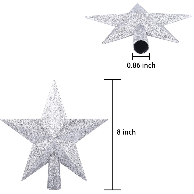 8 inches size, This size is good for your Christmas tree, Make your Christmas tree more beautiful. Specifications: Material: hard plastic Size: 8 inch/ 20 cm Color: glitter Quantity: 1 pack Package includes: 1 x 8 inch silvery tree top star