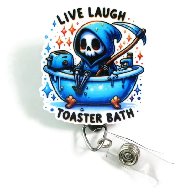 Live Laugh Toaster Bath: Funny Badge Reel for Nurses and Office Workers, Grim Reaper Badge ID Holder, Sarcastic Retractable ID Badge Holder, Funny Dark Humor Badge Reel