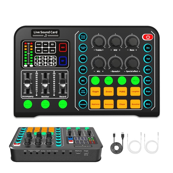 Live Sound Card, Bluetooth Professional Mini Audio Mixer Board with 15 Sound Effects, Audio Interface Support 48V Phantom Power, for Straming, Podcasting, Gaming