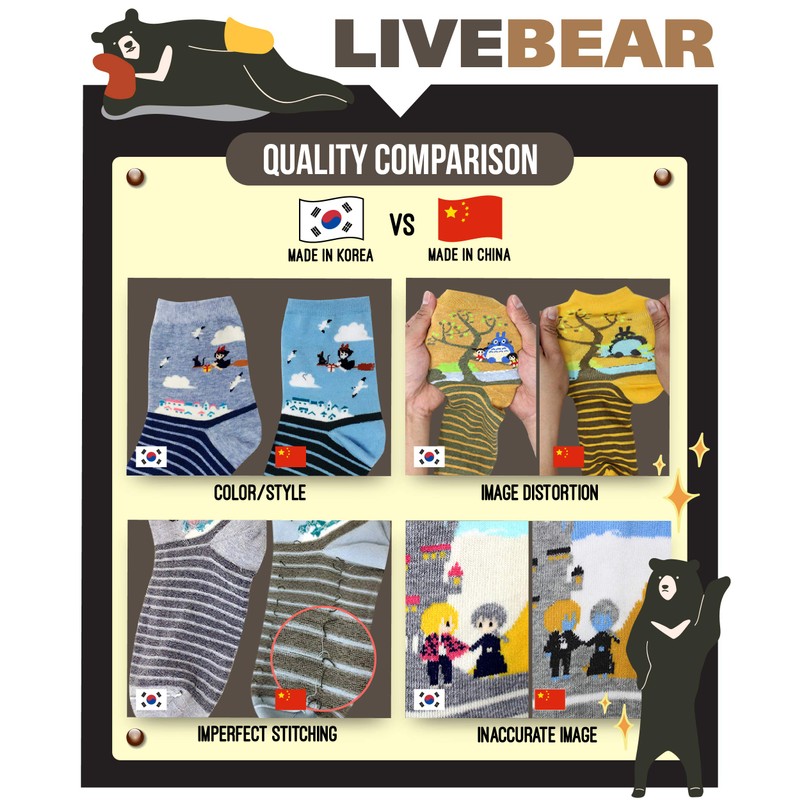 - Made In Korea: These socks are made and imported from Korea. Each sock is made from 70% Cotton, 25% Spandex, and 5% Poly. So, you can rest easy and be assured that we only deal with the highest quality of material.