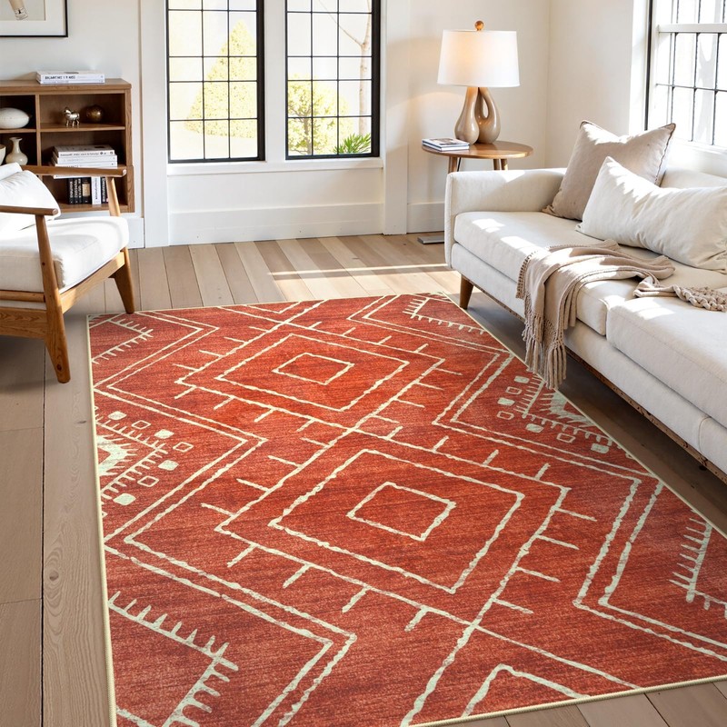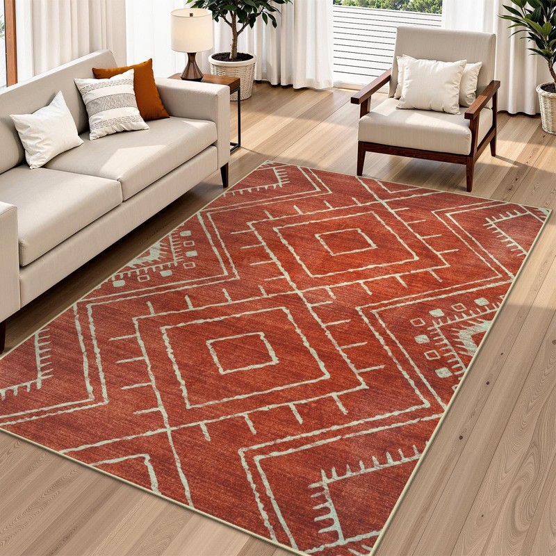 LIVEBOX Western 5x7 Area Rug, Washable Rugs for Living Room Bedroom, Non Slip Moroccan Tribal Rug Low Pile Modern Geometric Boho Area Rugs Diamond Carpet for Dining Room Home Office Decor (Brick Red)