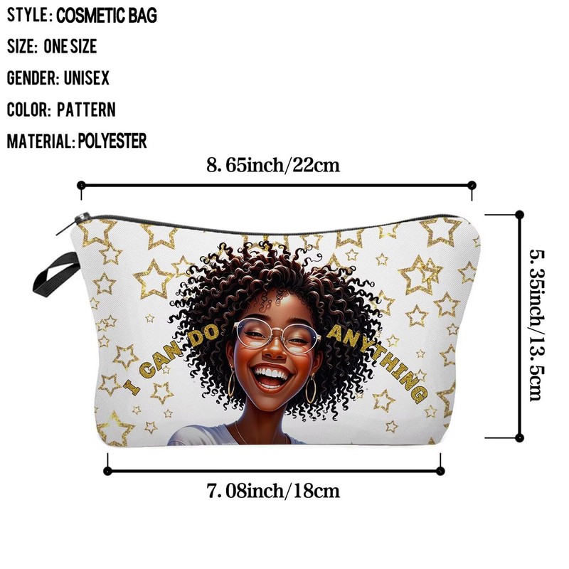 - 2.Fashion Design: The African American cosmetic bag has a clear and vibrant design, double-sided printing. There are different kinds of cute, lovely, funny and beautiful patterns to choose. The makeup bag fits both the popular aesthetic and unique personalities