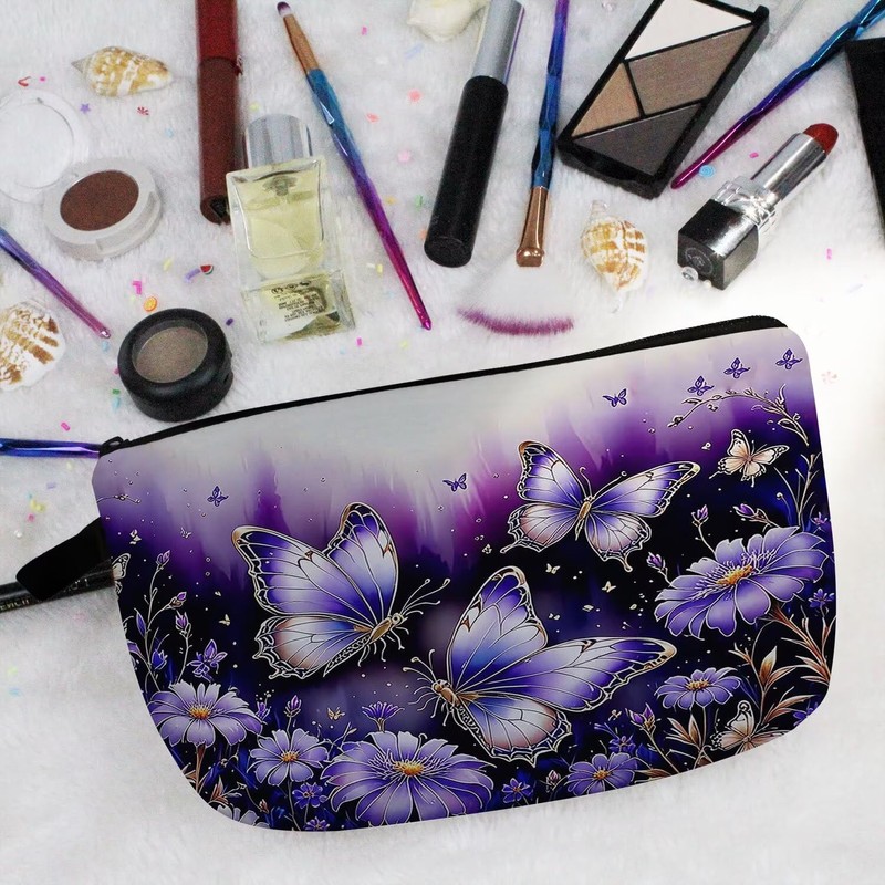 - 3.Good Size:8.65 in* 2 in* 5.35 in. 25 grams weight. The Purple Floral Butterfly cosmetic bag is easy to carry makeup tools like lipsticks, eye shadows, brushes, sunscreens, etc. The makeup bag is also able to carry stationery, medicines, coins, cards and other personal effects