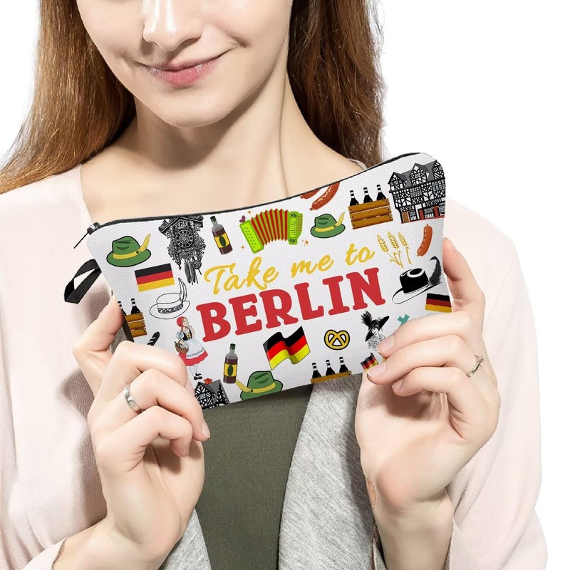 - 2.Fashion Design: The Take Me To Berlin cosmetic bag has a clear and vibrant design, double-sided printing. There are different kinds of cute, lovely, funny and beautiful patterns to choose. The makeup bag fits both the popular aesthetic and unique personalities