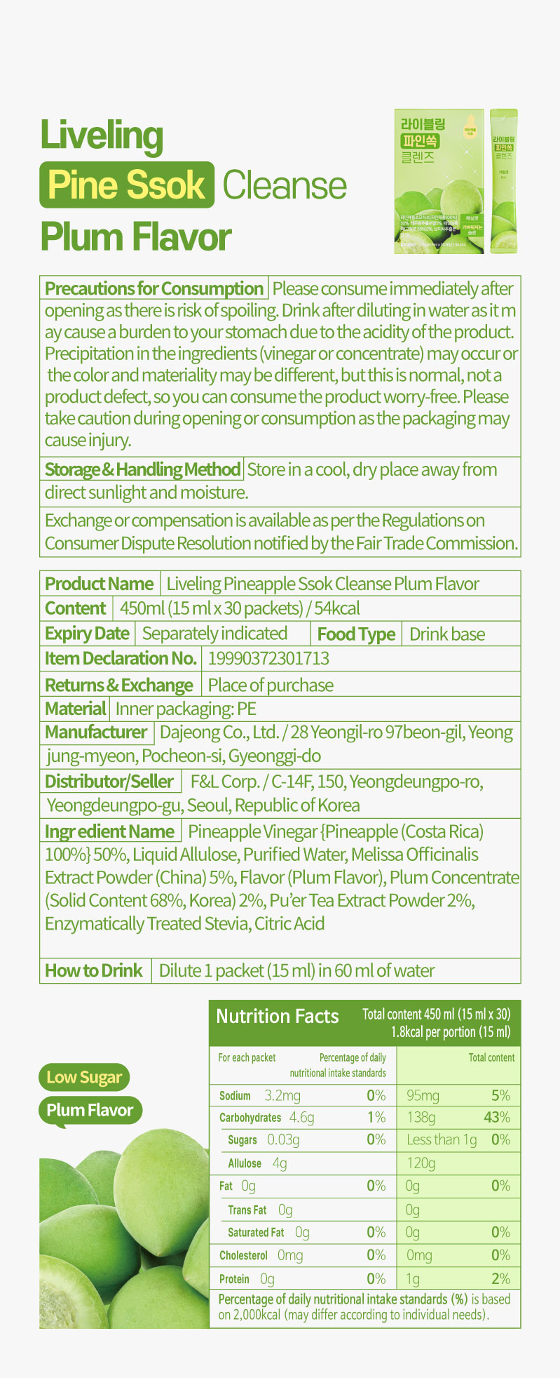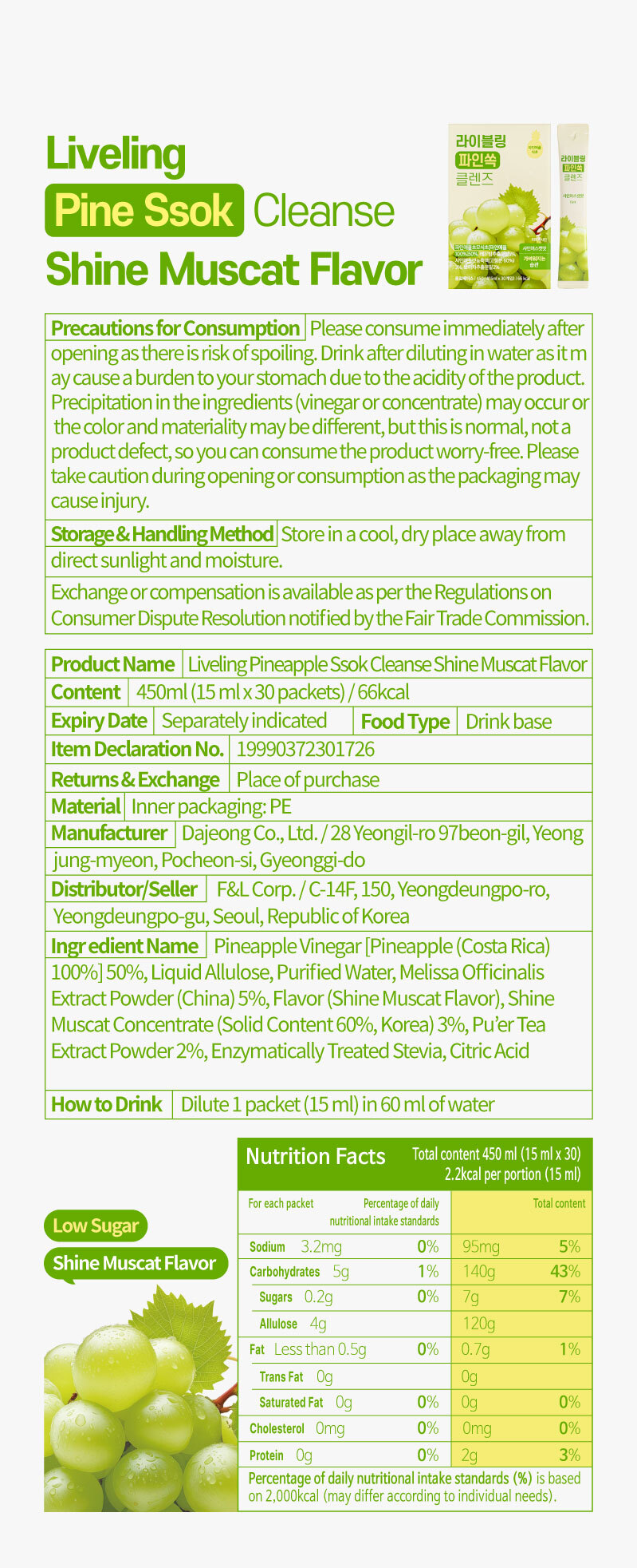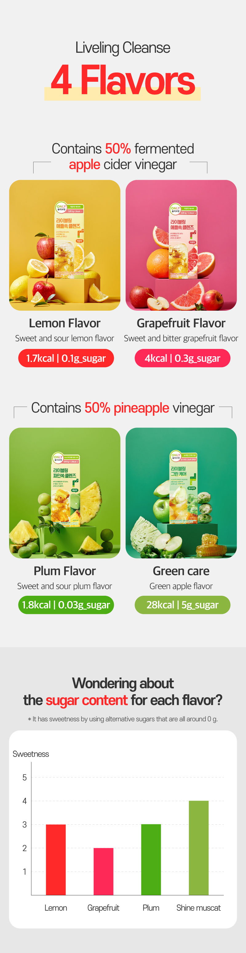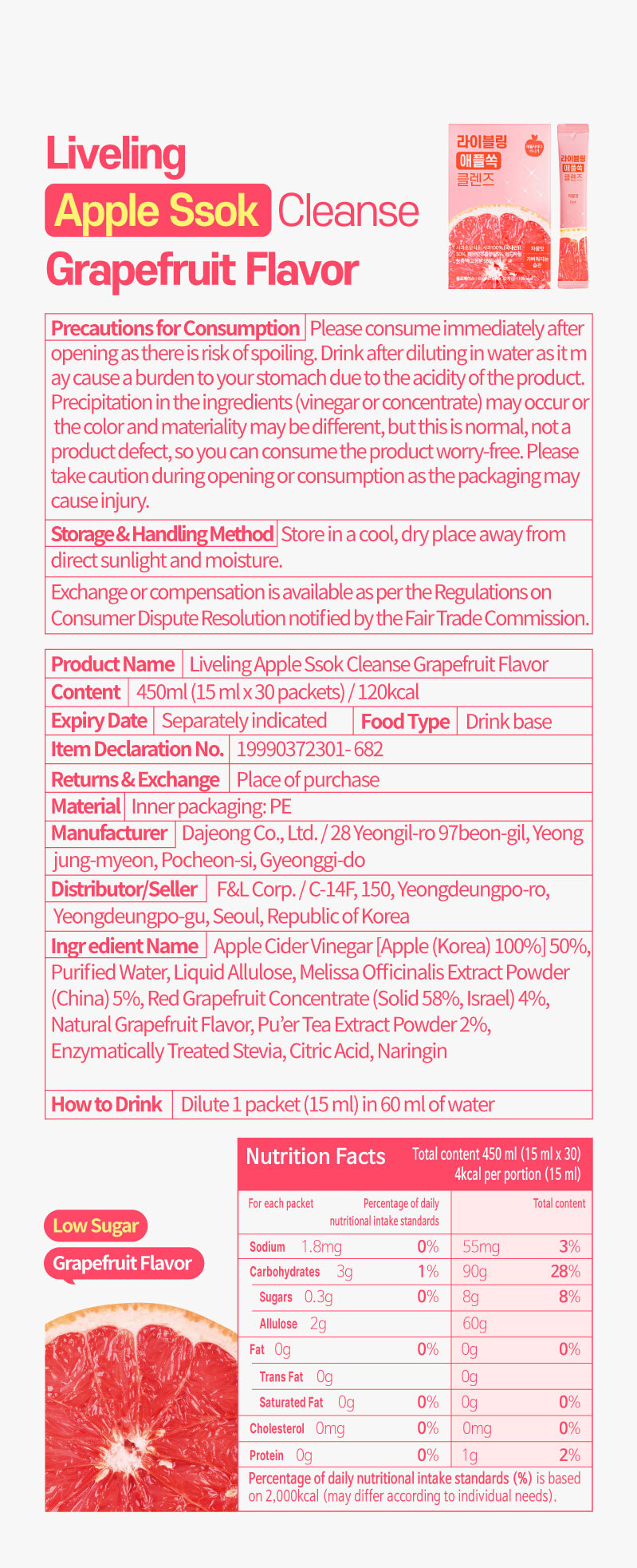 - Ingredients: Apple Cider Vinegar[Apple (Korea) 100%] 50%, Water, Liquid Allulose, Lemond Balm Extract Powder (Solid Content 100%, China) 5%, Red Grapefruit Concentrate (Solid Content 58%, Israel) 4%, Grapefruit Flavor, Pu’er Tea Extract Powder (Solid Content 100%) 2%, Enzymatically Modified Stevia, Ctric Acid, Naringin