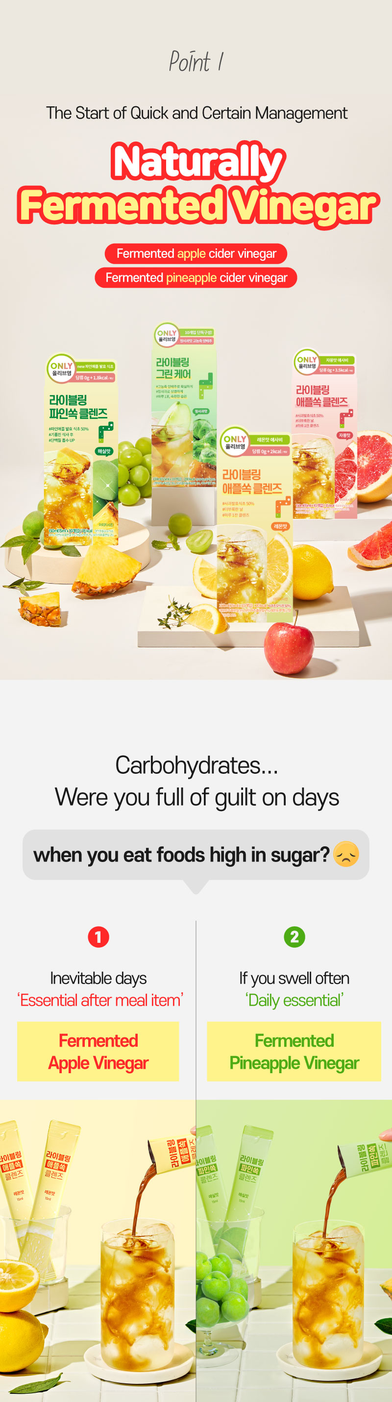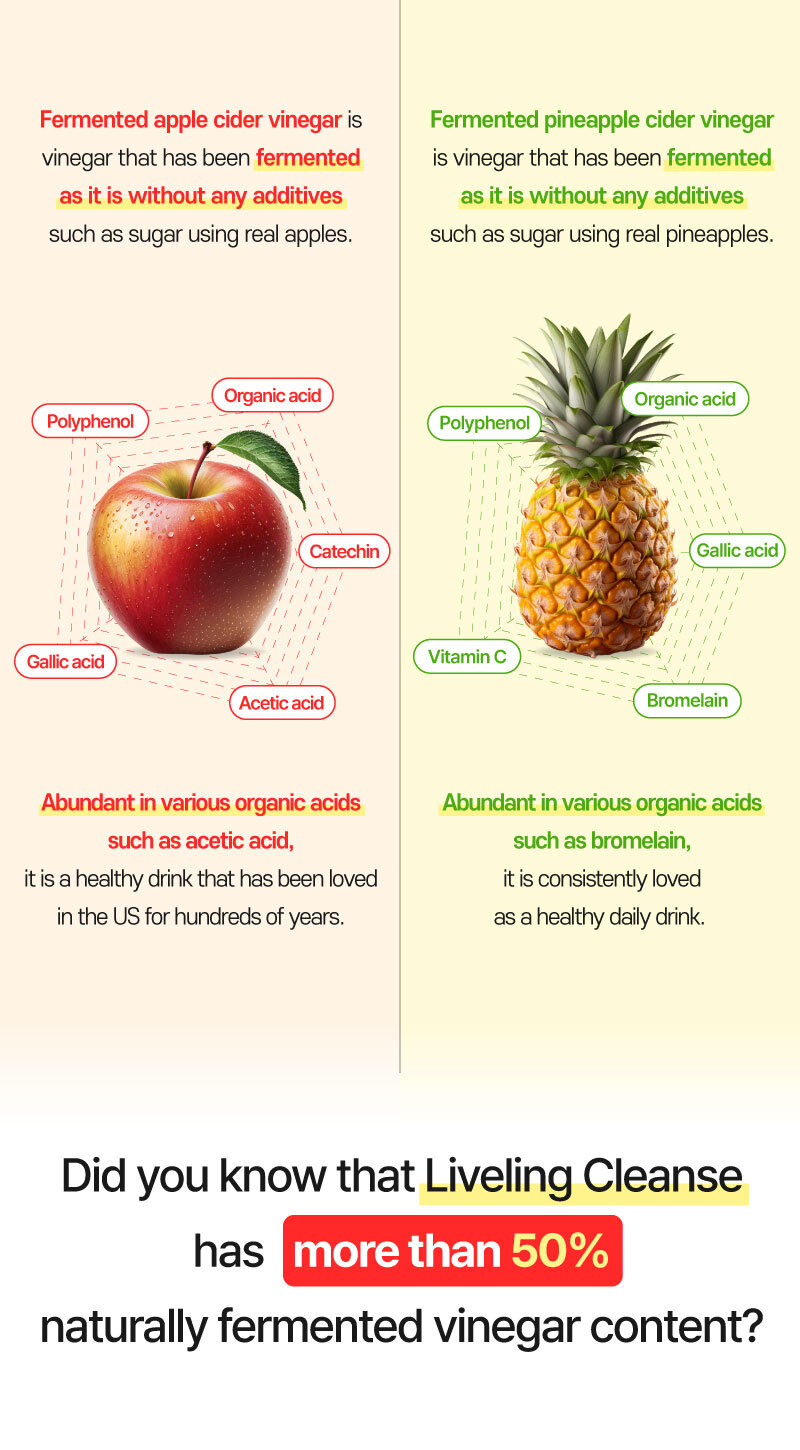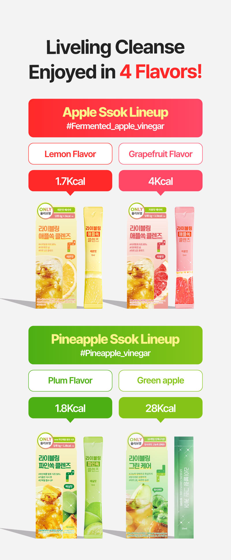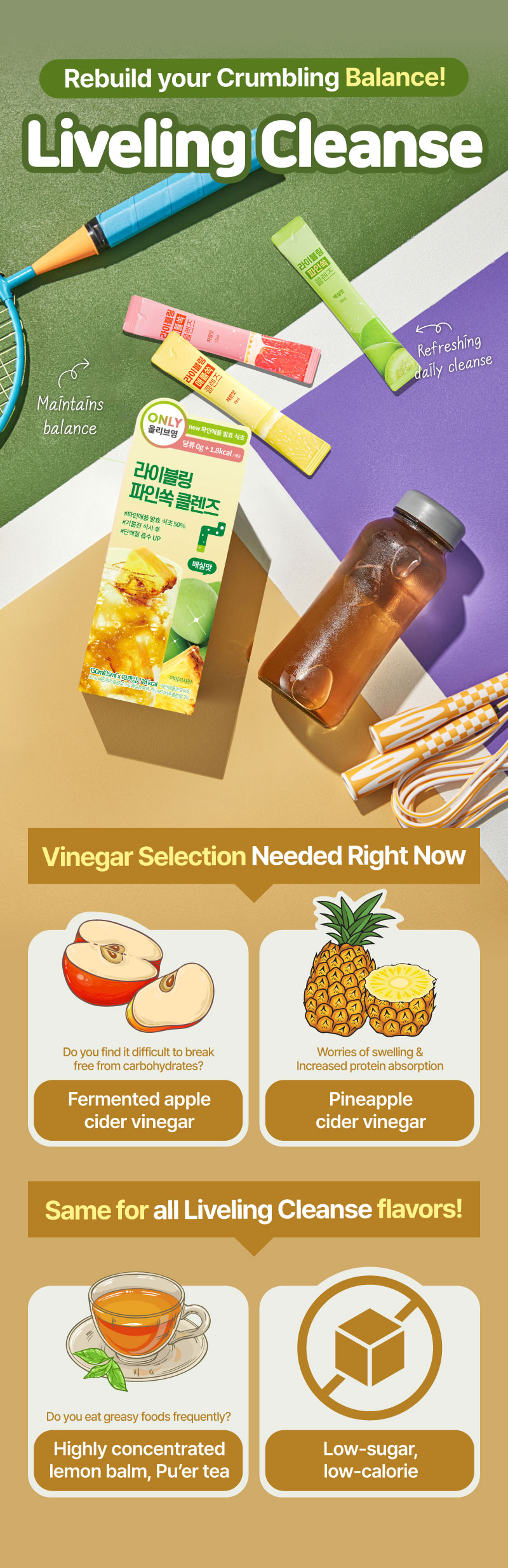 A product made with 50% apple cider vinegar, which has recently emerged as the hottest dietary item among American celebrities. Rich in various organic acids, including acetic acid, it is a cleanse beverage beloved in the United States for centuries. Crafted with meticulous ingredients tailored to Korean eating habits, it contains 20 times concentrated lemon balm extract, perfect for oily foods, and bocha extract, ideal for greasy foods.