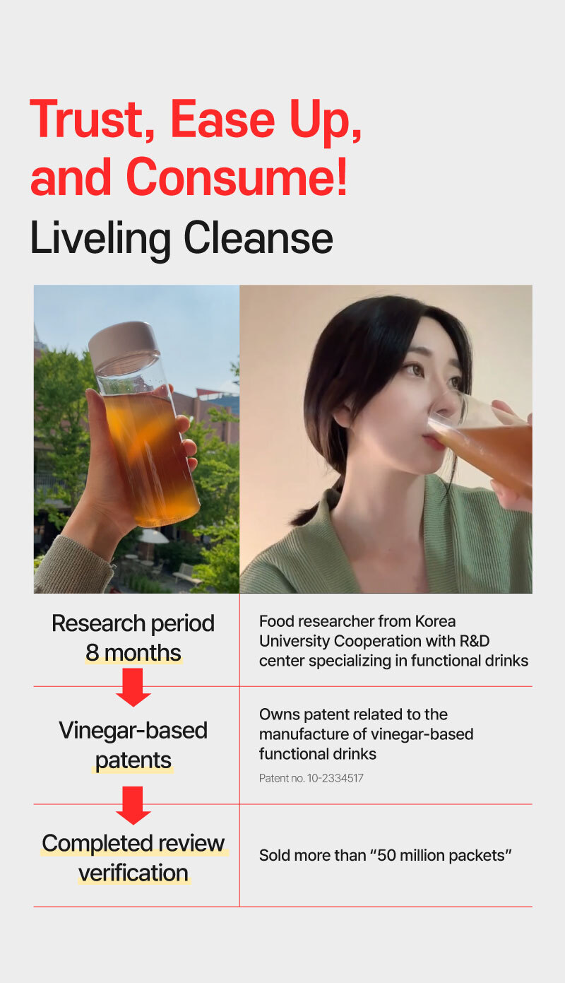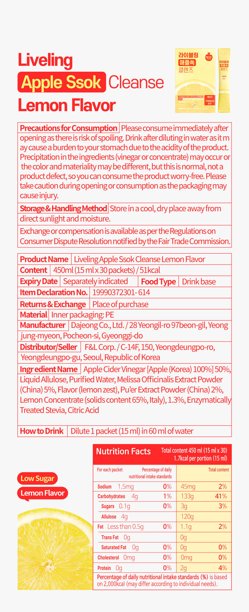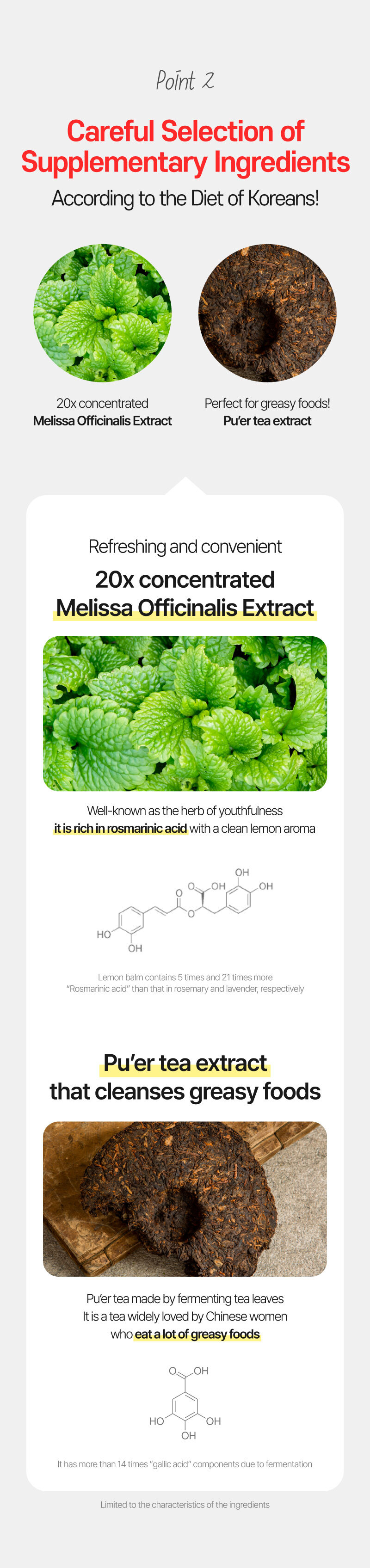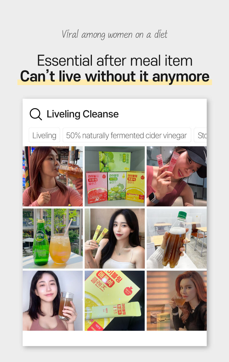 A product made with 50% apple cider vinegar, which has recently emerged as the hottest dietary item among American celebrities. Rich in various organic acids, including acetic acid, it is a cleanse beverage beloved in the United States for centuries. Crafted with meticulous ingredients tailored to Korean eating habits, it contains 20 times concentrated lemon balm extract, perfect for oily foods, and bocha extract, ideal for greasy foods.