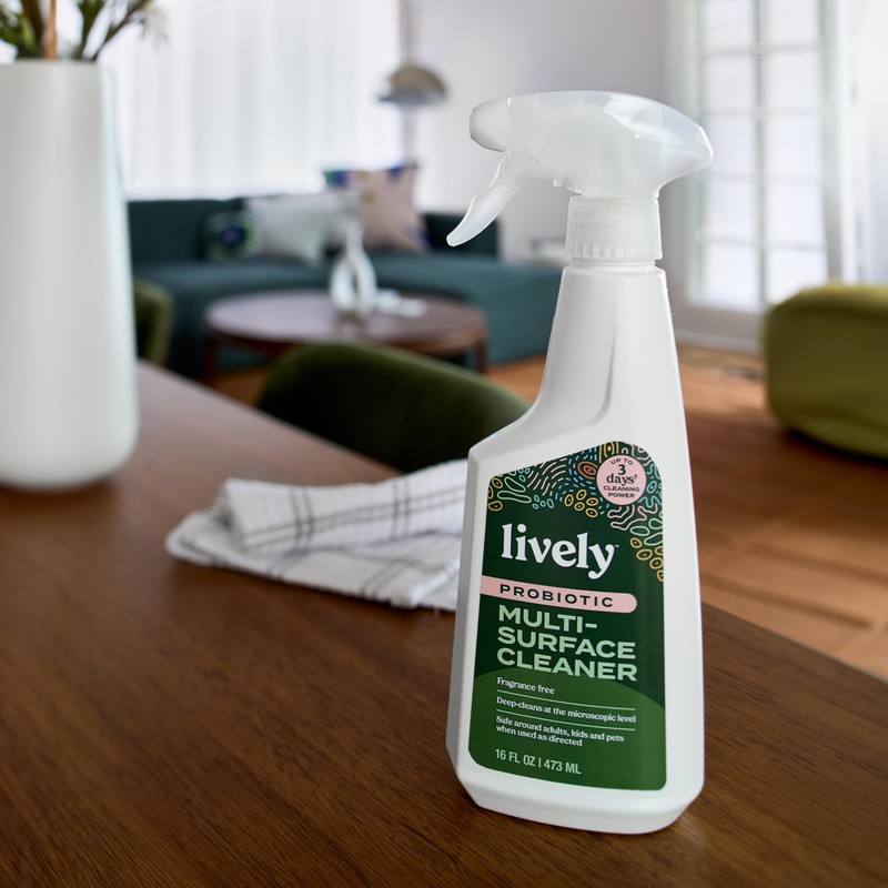 The Lively Probiotic Multi-Surface Cleaner is a versatile, multi-purpose, cleaning solution for various surfaces around your home, including countertops, sinks, bathtubs, mirrors, and sealed floors. Its natural probiotic formula continues working for up to 3 days, helping to eliminate dirt and grime at the microscopic level for a longer-lasting clean. It’s fragrance-free, biodegradable, and pH-neutral, making it a safe and effective solution for everyday cleaning.
