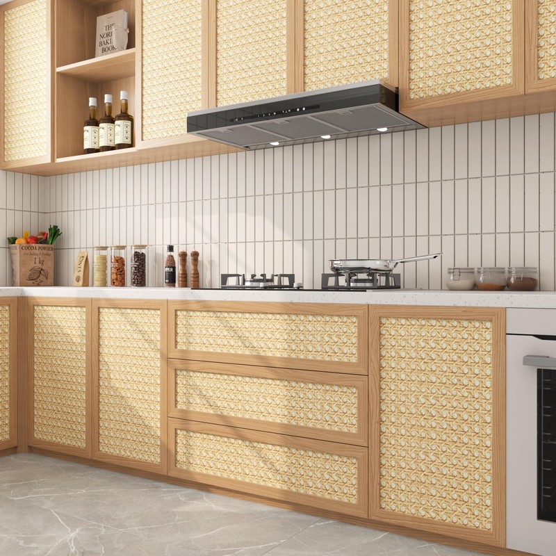 - All-PURPOSE: Faux rattan for cabinet doors, rattan contact paper for furniture, rattan peel and stick cabinet covering for kitchen, rattan roll for wall, vinyl wrap for cabinets, door wallpaper for closet, rattan wallpaper for bedroom dresser, brown contact paper for wood, sticky contact paper for crafts.