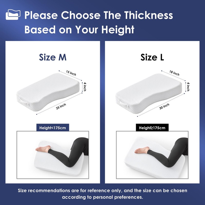 - IDEAL LENGTH AND THICKNESS: Unlike traditional small knee pillows, our pillows fully support the entire calf from knee to ankle, providing separation for ideal sleep positions. We have two sizes, size L is recommended for 165cm and above, size M is recommended for 165cm and below. Reasonable thickness is ergonomically designed to ensure that it is not too thin to correct or too thick to cause spinal and pelvic discomfort.