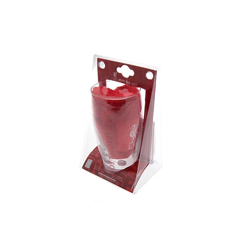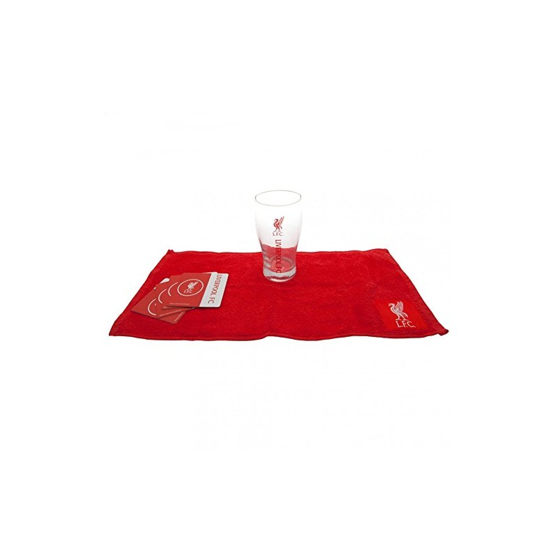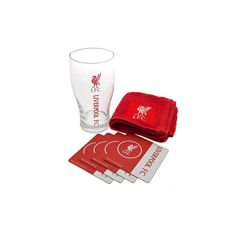 • Contiene un vaso de pinta 4 alfombrillas de cerveza y también tiene una toalla de bar, todo con el escudo del club del Liverpool en la parte delantera