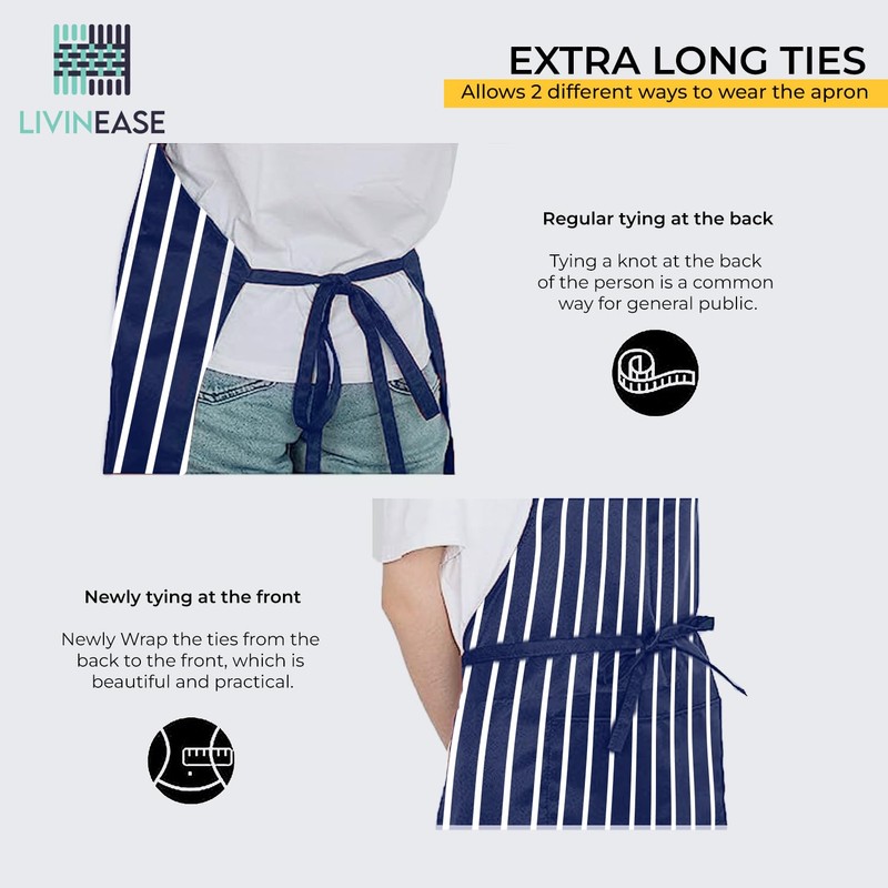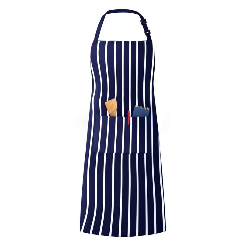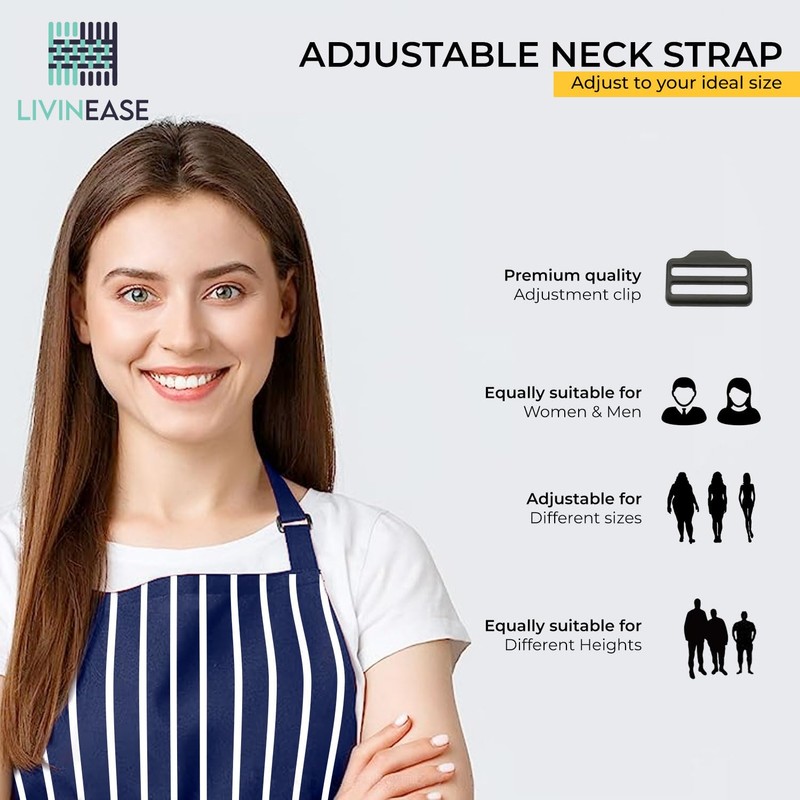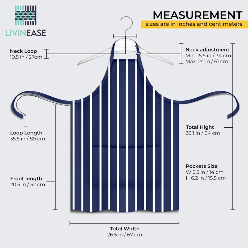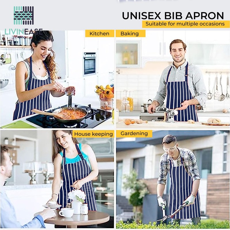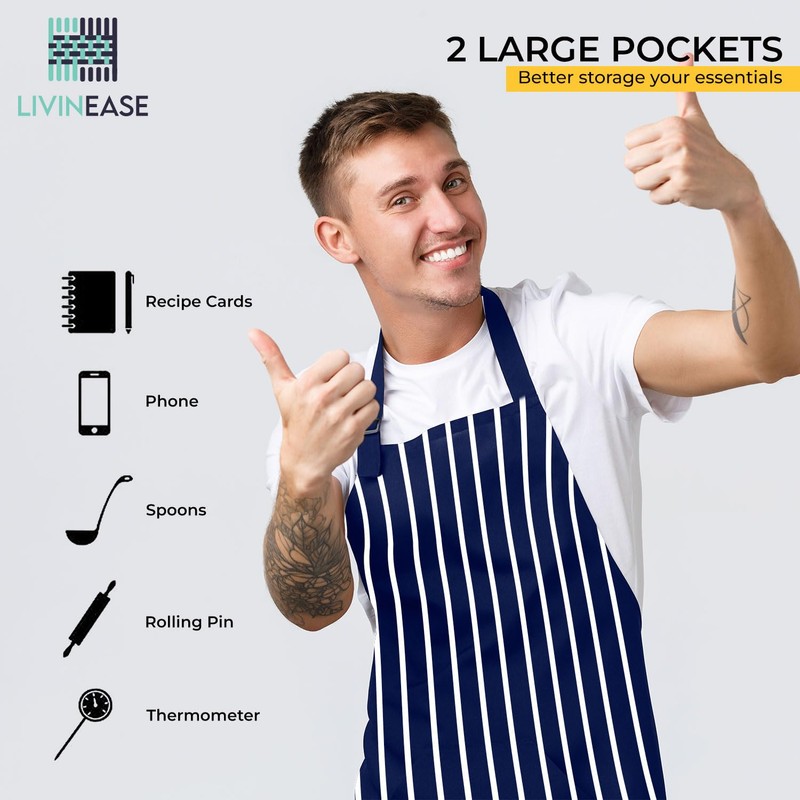 LivinEase Unisex Adjustable Bib Aprons - Stylish Navy with White Stripes Chef Aprons with Double Pockets for Men and Women – Ideal for Cooking, Gardening, and Barbecue Aprons (Pack of 1)