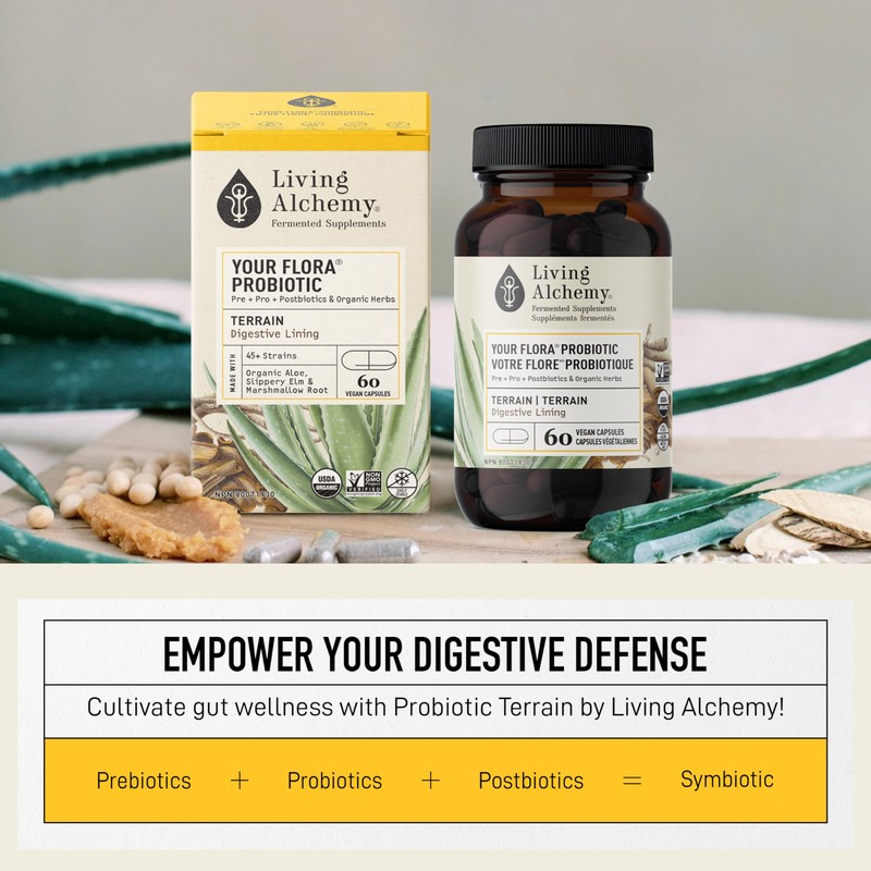 Living Alchemy Gut Health Supplement - Your Flora Probiotic Terrain with Fermented Soybean, Aloe Vera, Prebiotics, Digestive Enzyme, Probiotics for Men & Women - Vegan, Non-GMO - Living Alchemy, 60 Pcs