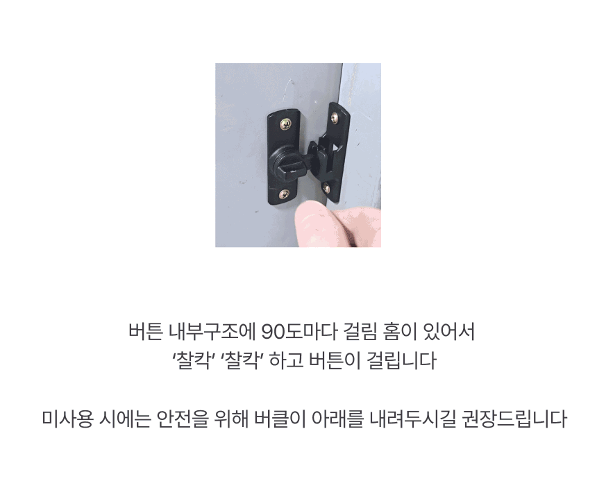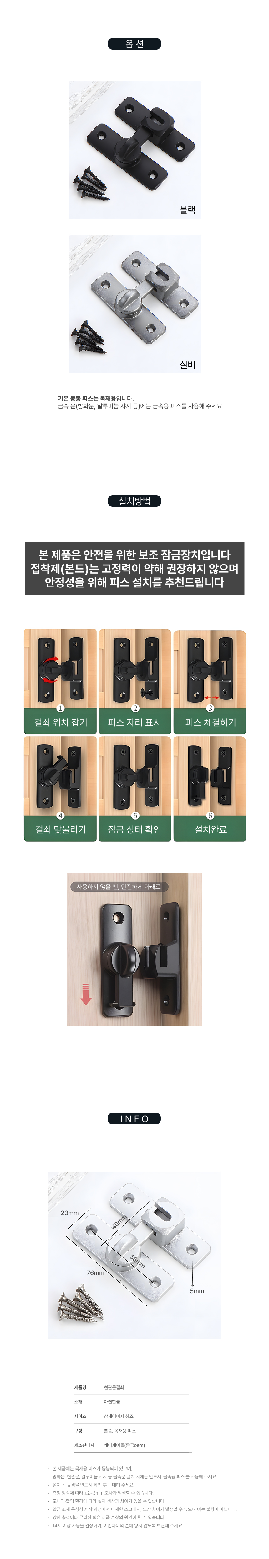 - Installation Method: Position latch, mark screw holes, fasten screws, align latch, check locked state