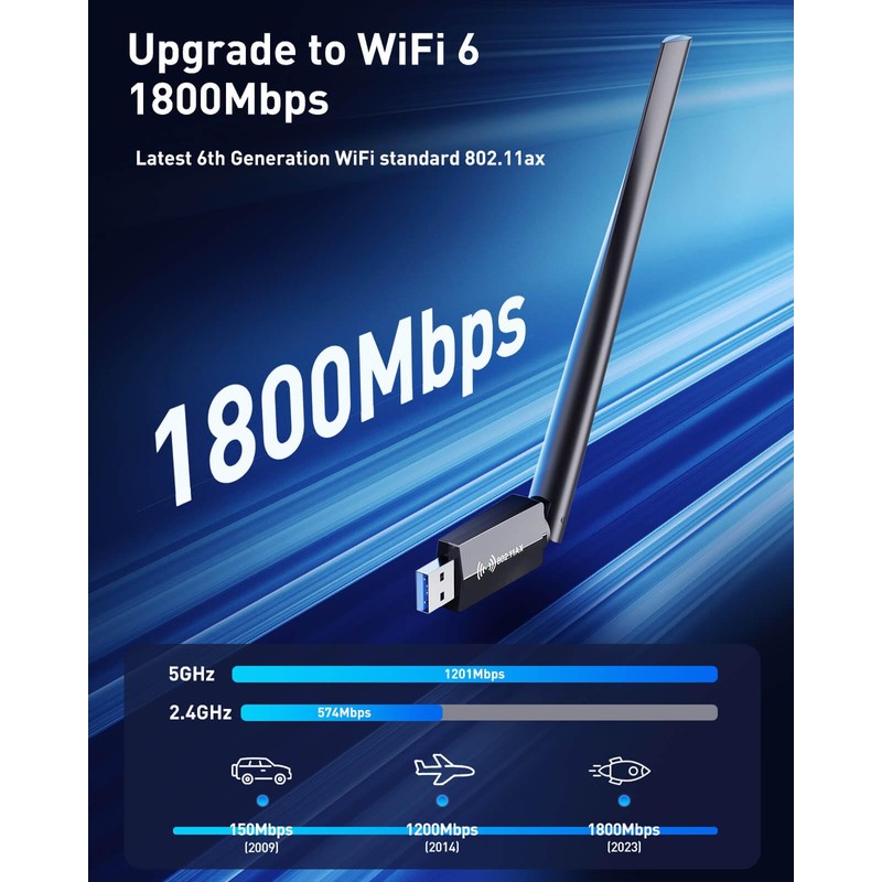 - Fast Speed 1800Mbps WiFi Adapter for desktop pc - Based on the advanced wifi 6 802.11ax technology reduce lags for PC. Upgrade your 300M usb wifi adapter to 1800Mbps wifi adapter,the WiFi 6 adapter provides long rang and stable wifi connection. You can enjoy superior speeds and a stable connection, perfect for gaming, streaming, and downloading