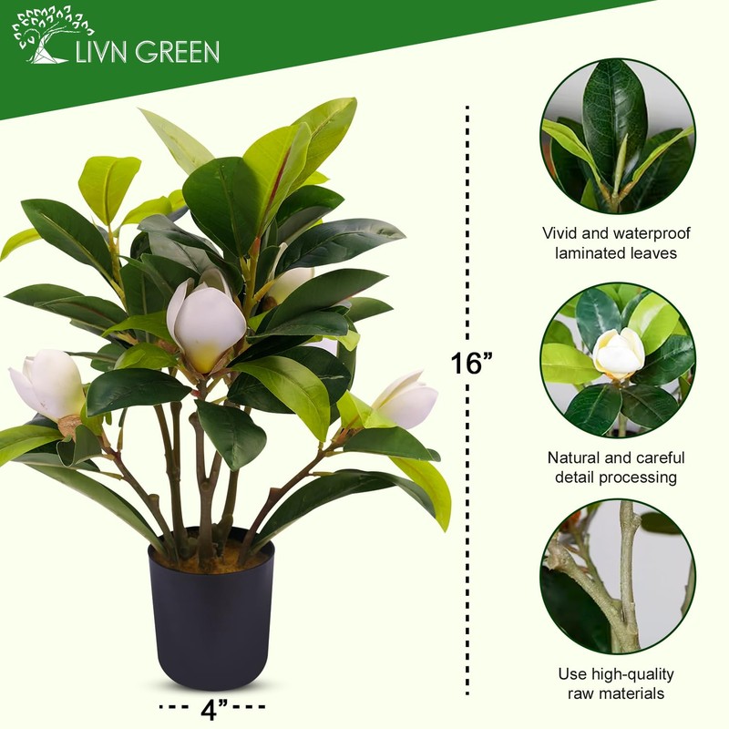 LIVN GREEN 16" Artificial Magnolia Stems in a Pot, Artificial Magnolia Branches with 5 White Flowers, Small aritificial Magnolia for Home or Office Decor, Faux Magnolia Flowers