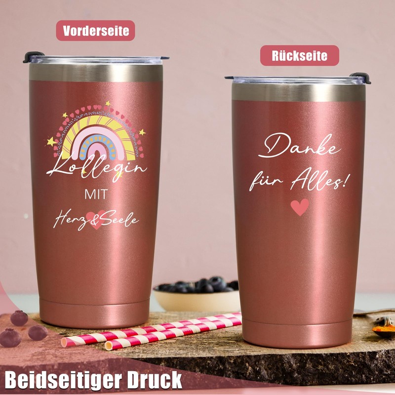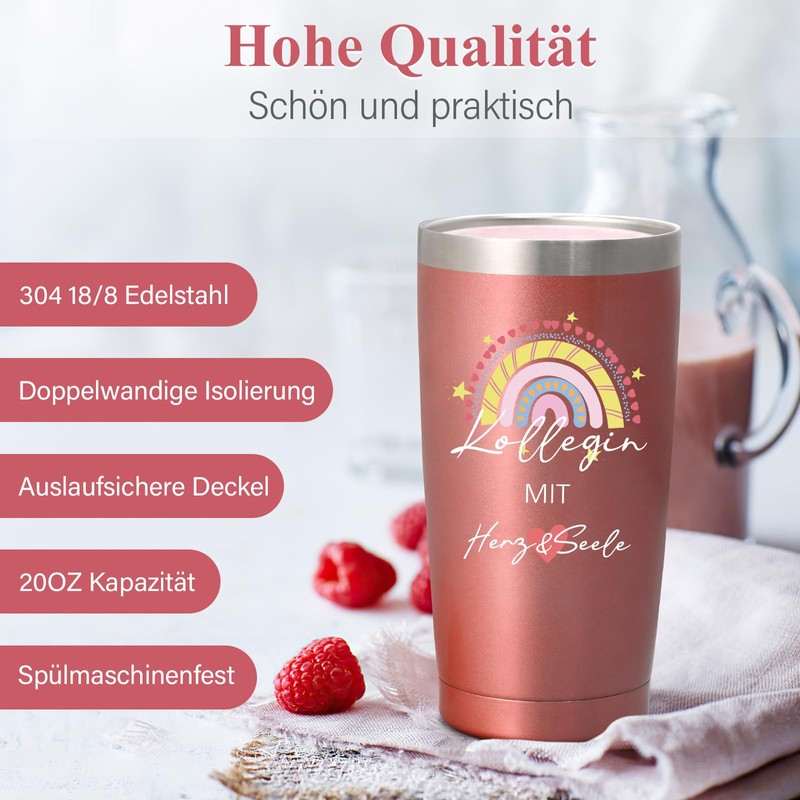 With the print "Kollegin mit Herz & Seele. Thank you for everything", this coffee mug is the perfect Christmas, birthday and farewell gift for a colleague. She will be pleasantly surprised when she receives this exquisite tumbler.