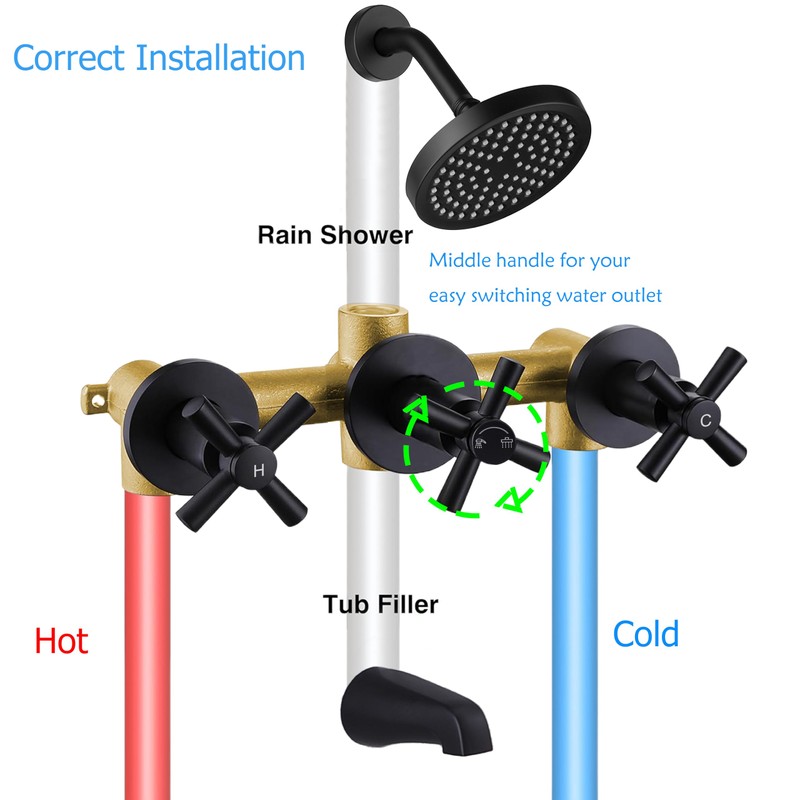 - 【 Three knob classical Handles 】 The shower faucet set with 3 knobs handles can easily adjust the water temperature and flow with the sleek operations. Switch water from the rain shower to filler spout by the middle cross handle.