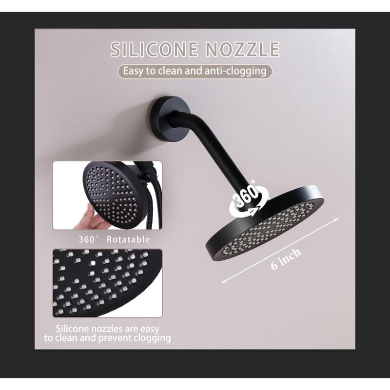 - 【6 Inches Shower Head】Matte black ultra-thin and large shower head, ensuring water saving and providing aesthetic appeal. Six inches large size and 360° rotation top shower provides continuously a covering your body.