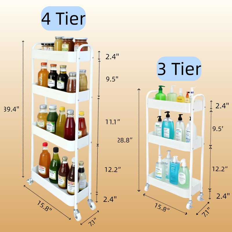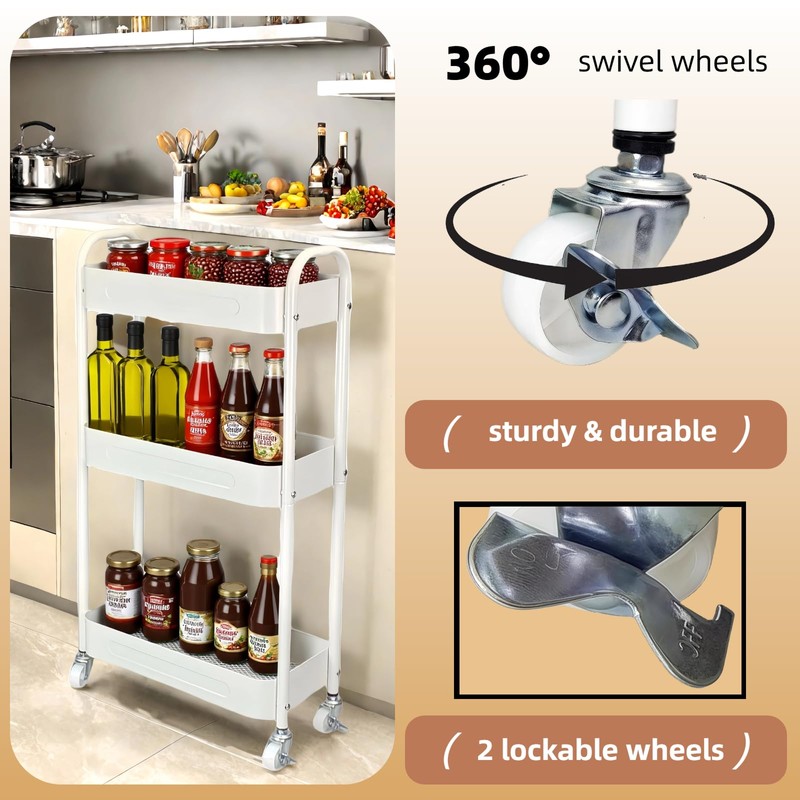 The Perfect Storage Solution for Every Space Upgrade your home organization with our multi-functional rolling utility cart—an essential storage solution designed for convenience, mobility, and style. Whether you need extra space in the kitchen, bathroom, laundry room, dorm, or office, this slim storage cart with wheels is the perfect addition to keep your essentials neatly organized and within reach. This rolling island cart for kitchen provides extra counter space while keeping spices, utensils, and cookware easily accessible. Use it as a kitchen storage cart to hold snacks, small appliances, or fresh produce, or transform it into a kitchen island with storage for added functionality. With its slim trolley carry design, this narrow shelf fits seamlessly in small apartments, dorm rooms, or offices. Students will love it as dorm storage for books, school supplies, and snacks, while professionals can use it as a rolling kitchen cart to keep documents neatly organized. Handy around the house or workspace, this metal utility cart on wheels is also perfect as a rolling cart with shelves for garage organization or a rolling cart for teachers to store classroom materials. The white rolling cart option adds a clean, modern touch to any decor, while the rolling cart metal frame ensures long-lasting durability. Why Choose Our rolling metal cart? Sturdy & Durable – Made from high-quality metal with a sleek finish. Smooth-Gliding Wheels – Two locking casters for stability and easy movement. Versatile Storage – Adjustable shelves or spacious tiers to fit various items. Space-Saving – heavy duty rolling cart fits in tight spaces. Multi-Purpose Use – Perfect as a storage rolling cart, office organizer, or craft station.Don’t let clutter take over your home,our rolling organizer cart is the perfect solution for keeping every room tidy. Whether you need a rolling book cart a bathroom organizer, or a laundry helper, this cart adapts to your needs.