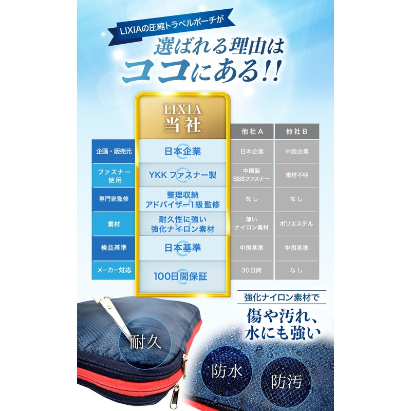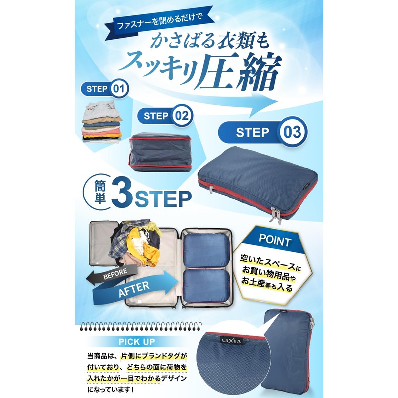 LIXIA Travel Compression Bag, 2-Way Space Saving, YKK Double Zipper, Travel Pouch, navy