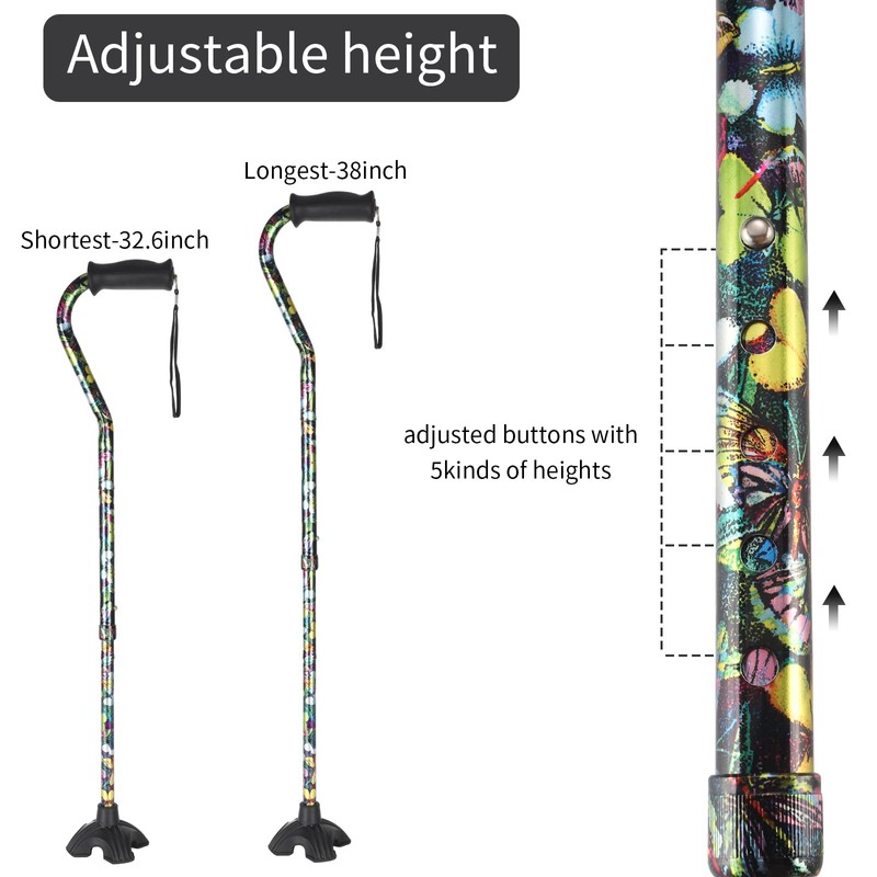 - [Adjustable and foldable] The foldable canes has a built-in adjustment button, which can be easily adjusted to 5 convenient heights immediately, ranging from 32.6 inchesto 37.8 inches. At the same time, this folding design can be more convenient for daily use or travel.