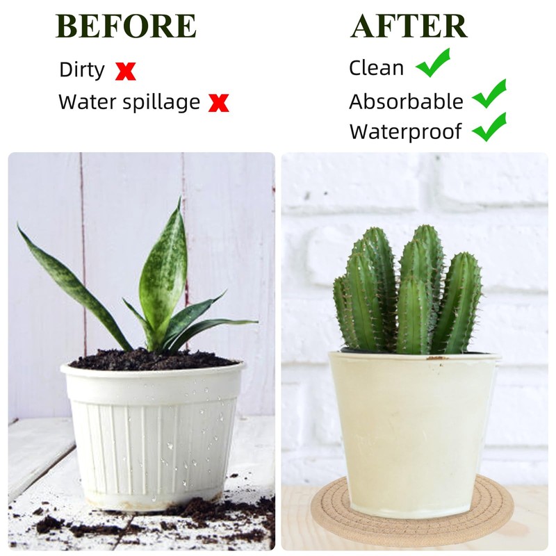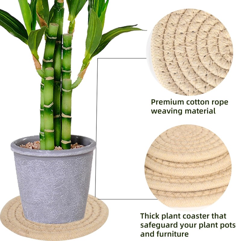 - 【Premium Material】Our round woven coaster are made of cotton and linen. They are non-toxic and free from any unpleasant odor.This coaster quickly absorbs any drips or spills, and then magically evaporates them, ensuring your plant pot stays dry and pristine. These durable plant saucer can be used repeatedly, providing great value for your money.