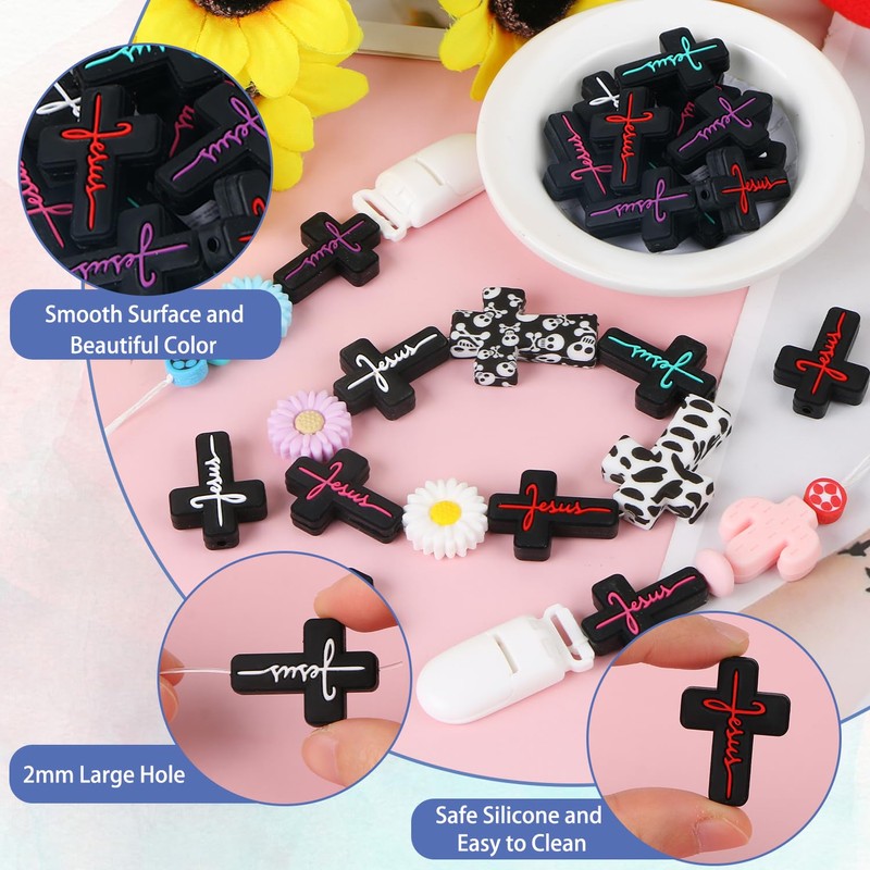 LIYDE 15 Pcs Religion Silicone Beads for Jewelry Making Jesus Faith Silicone Beads Bulk for Pens Silicone Beads with Box Cross Shaped Spacer Loose Beads for DIY Crafts Bracelets Making