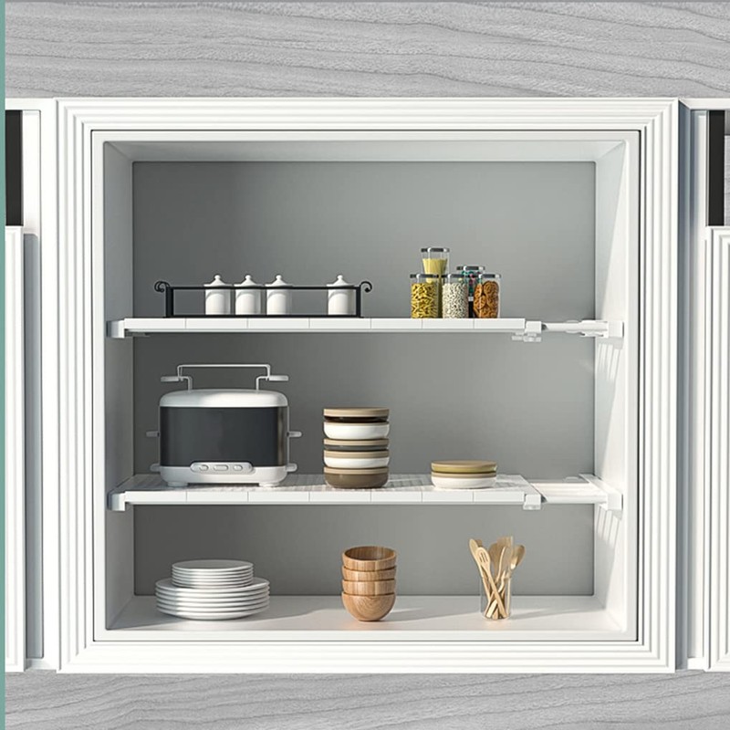 - Multi-purpose Closet Shelf: This Closet shelf is useful to fit in kitchen cupboards, wardrobes, under kitchen/bathroom sinks, bookcase, above refrigerator/washer/dryer, travel trailer closets, RV cabinets, shoe organizer and other unused vertical space, to provide extra storage space and shelving.
