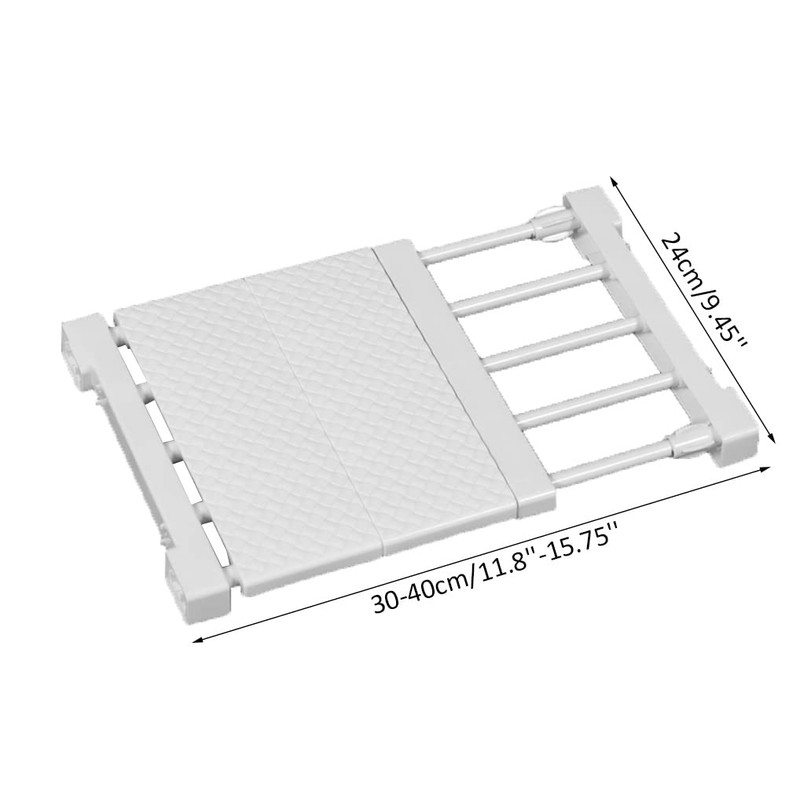 - Heavy Duty and Durable: Made of plastic spraying carbon steel pipe, PP and ABS; anti-skid pads at the bottom of both ends. The length can be adjusted from 30cm to 40cm (11.8" to 15.75'') and the width is 24cm/9.45" (the width can't be adjusted). It can be used as cupboard divider, wardrobe shelf, shoe rack, bookshelf, clothes hanger, shelving unit or plants/flower pots stand.