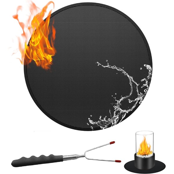 Liyquint fire Pit Mat for Under Fire Pit,Round Fireproof Mat, 3 Layer Heat Resistant Mat Fire Pit Mat with Retractable Grill Fork Great for patios, decks, grass, lawns BBQ mat under grill Mats (Black)