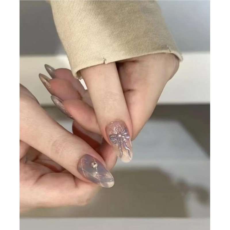 LIyun&Hang 3D Press on Nails Oval Shapes 24Pcs Glossy Full Cover Artificial Fake Nails, bowknot and Dridding With Rhinestones Pearl Flashing Design, Reusable Luxury jelly glue Stick On Nails (type-12)