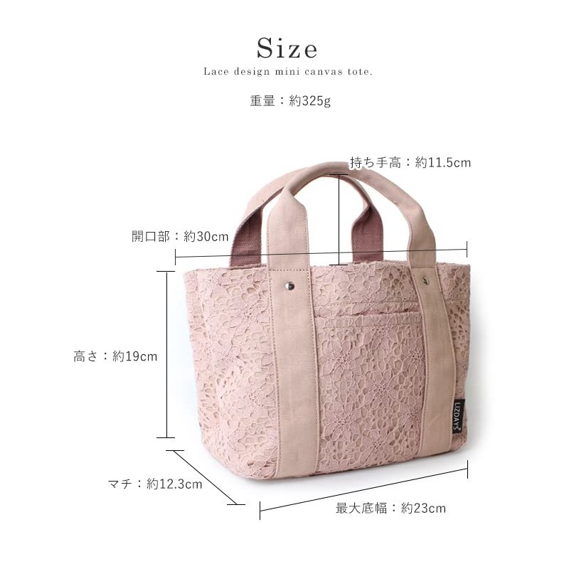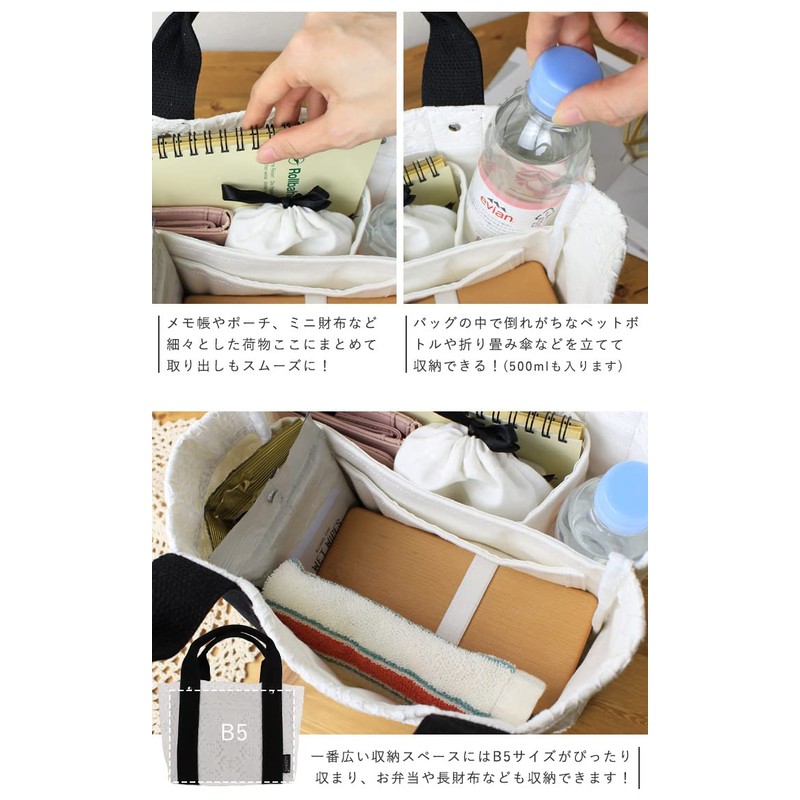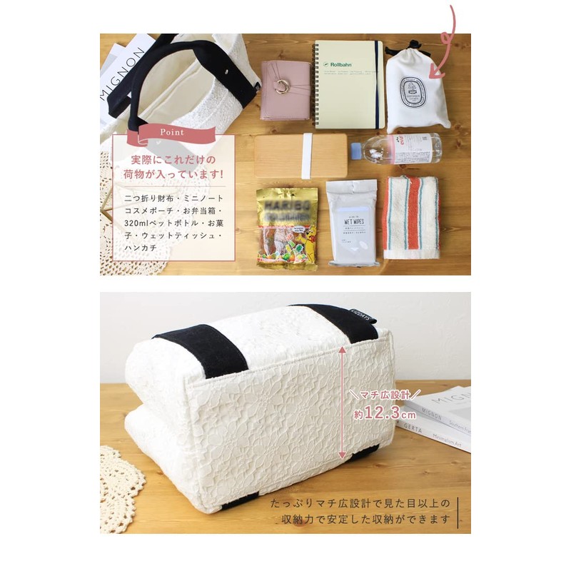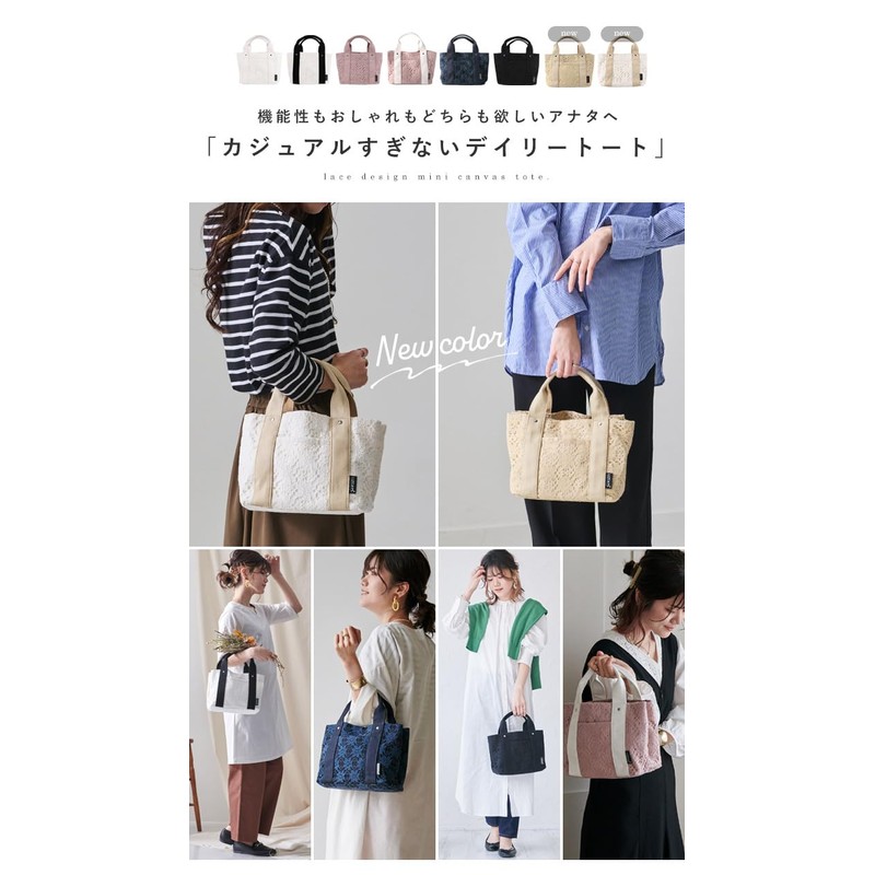 - A classic and popular mini tote bag with dividers. Once you use it, you won't want to take it off! From the beloved partition tote that has received many feedbacks, this gorgeous "lace" design is now available to make it more stylish. Compared to canvas type with a casual impression with delicate floral lace on the same color fabric with a uniform feel, it gives a mature and feminine look
