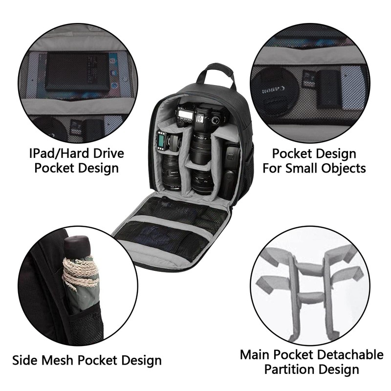- Flexible Storage: This camera and lens bag provides 7 rooms with 6 pieces padded removable dividers which can hold 1 camera 6 lenses. The pad can be freely changed according to different needs and different occasions, you can DIY the inner space by removing the thick dividers based on your equipment. Inside there are 2 zippered mesh pockets for accessories. Mesh sides pockets can used for bottle and umbrella etc. The camera backpacks for photographers is compact design but enough capacity.