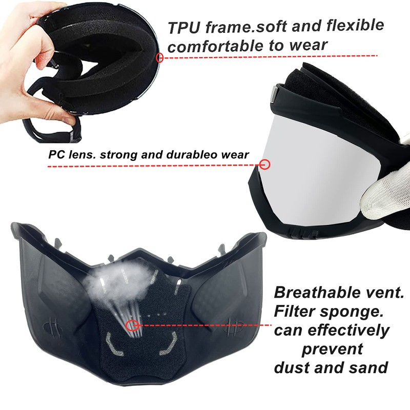 - PROFESSIONAL PROTECTION --- √ Motorcycle goggles with a detachable mask not only increase the protection area, but also better protect your eyes out of wind , bugs, dust, sand, and even help to prevent cold air. Also the goggles can be used separately as needed.