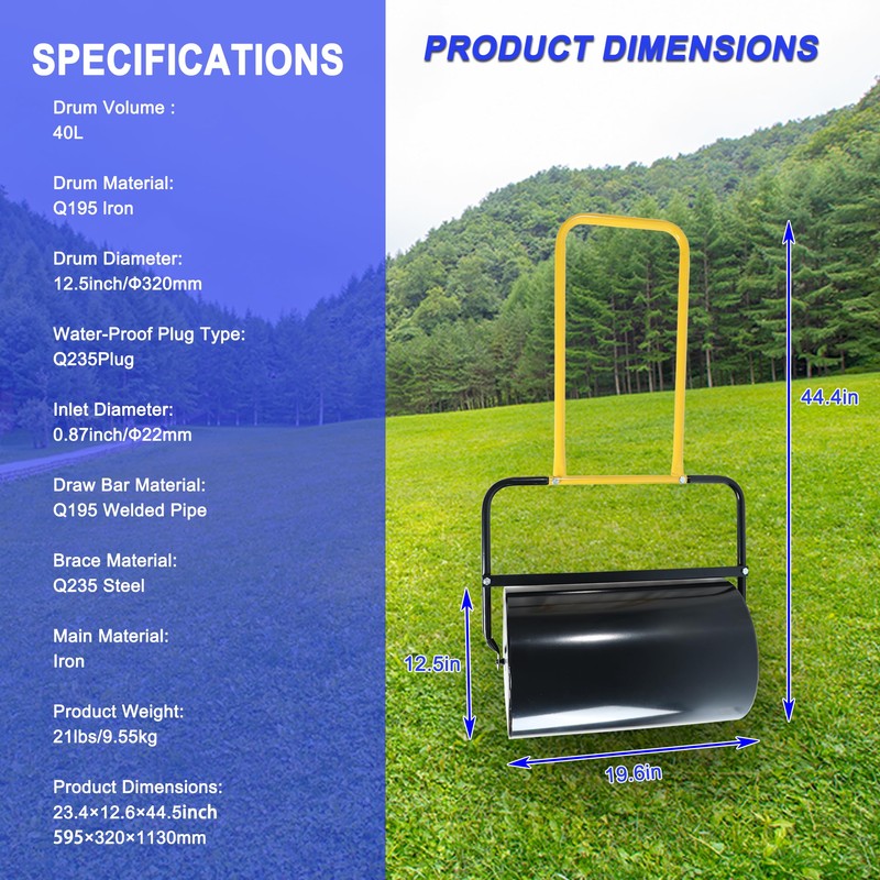 - use for various applications including lawn care, sports fields, and parks, effectively compacting soil after seeding.