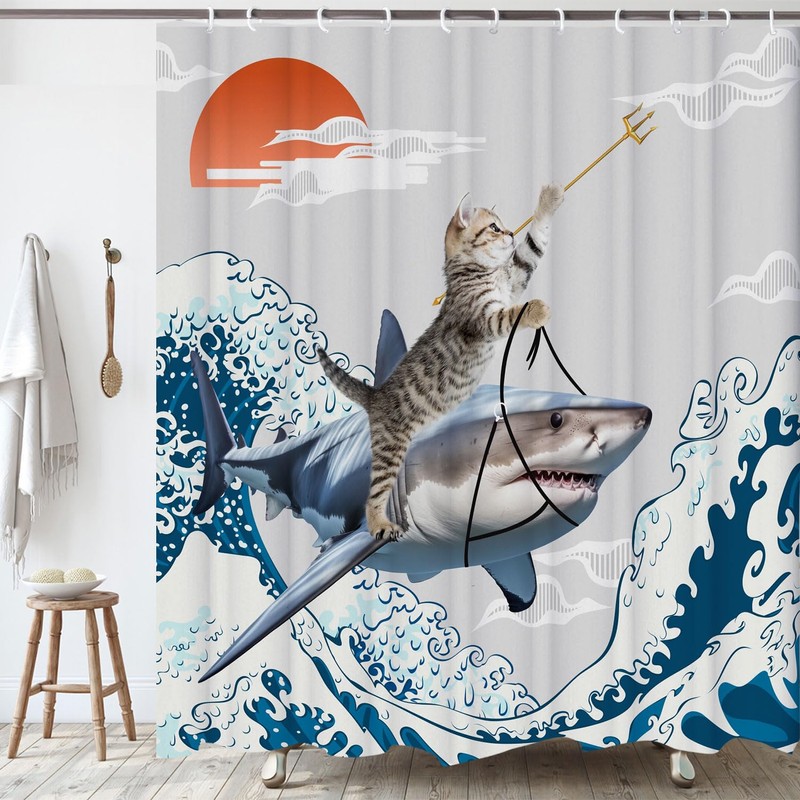 LKFBSC Funny Cute Cat Shower Curtains,Japan Cat Shark with Ocean Sea Wave Shower Curtain for Bathroom,Japanese Cool Fabric Shower Curtain Set with Hooks Bath Decoration 72X72inches