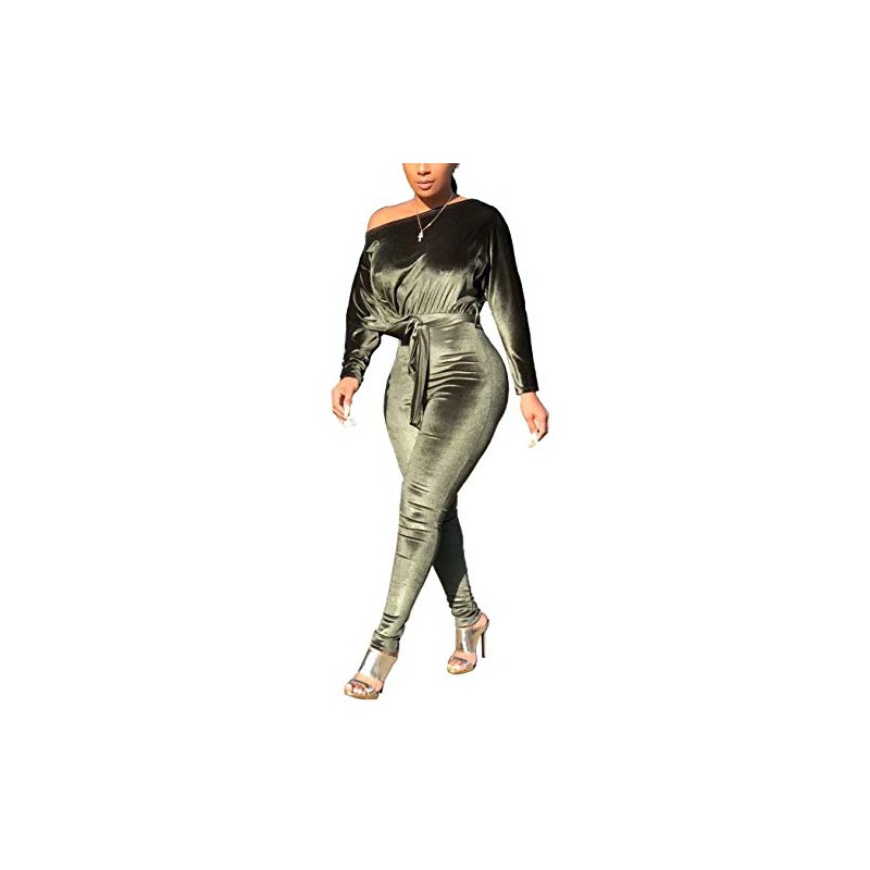 LKOUS Women Velvet Off Shoulder Jumpsuit Long Sleeve Bodycon Pants Suit One Piece Romper Party Clubwear with Belt