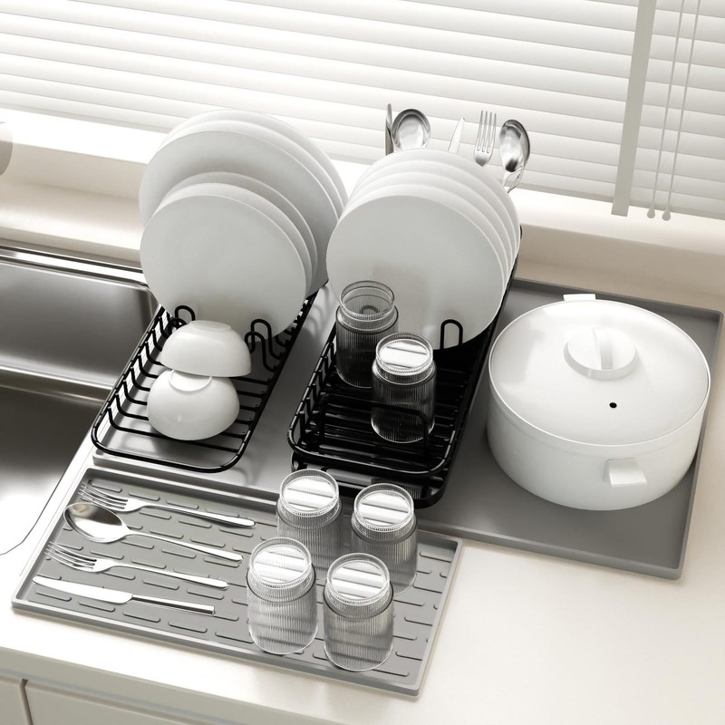 - Two-Part Design: The coffee machine mat has 2 areas.The main mat provides a spacious and heat-resistant surface to place your coffee maker,ensuring your countertops remain clean and protected from spills.It also includes a detachable dish drying mat that can be easily removed and used separately. You can place the coffee bar mat according to your own ideas.