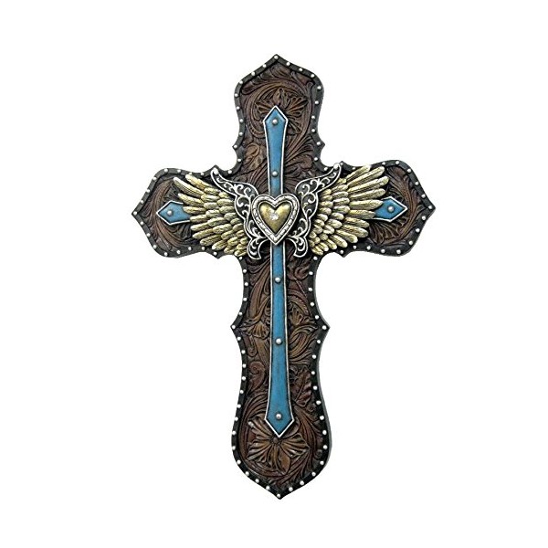 - Beautifully crafted hanging blue cross with wings and heart accent