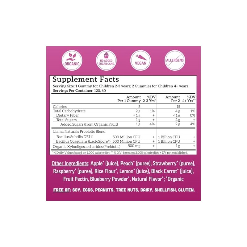 Llama Naturals Kids Probiotic with Prebiotic Fiber, Vegan, Organic Prebiotics and Probiotics Gummies for Gut Health Support, Toddler Real Fruit Gummy Vitamins, No Added Sugar Cane, Mixed Berry, 120 Ct