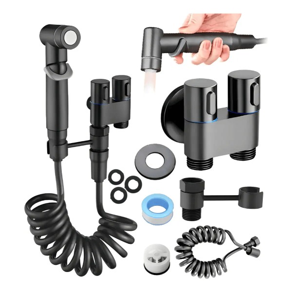 Control doble de 1 entrada y 2 salidas: fabricado en latón de alta calidad, moldeado a partir de una sola pieza, se puede conectar al inodoro y a la lavadora al mismo tiempo, ahorrando espacio y tiempo. El núcleo de la válvula está hecho de cerámica, no se rompe, no se deforma fácilmente y es duradero. Materiales de alta calidad: proceso de pintura con aerosol, resistencia al bordado y resistencia a la corrosión. Diseño completamente nuevo: puede contener 2 cabezales de ducha, lo que proporciona una experiencia de ducha diferente y un doble disfrute. La superficie de la combinación de accesorios de ducha es mate, lo que es misteriosa y fácil de limpiar y mantener sin mostrar suciedad. 2 válvulas de cierre independientes: interruptores dobles para la descarga de agua, que pueden descargar agua al mismo tiempo sin que se afecten entre sí. Se puede ajustar de forma individual. Gracias a la función de cierre que ahorra agua, disfrutarás de una ducha suave. Fácil de usar: puedes cambiar el pomo para encender el cabezal de la ducha tipo lluvia, el cabezal de ducha manual o la boquilla de la bañera según sea necesario (no se pueden encender al mismo tiempo). Two versatile mounting options: 1. Tank installation: simply attach the bidet sprayer bracket to the toilet cistern to save space in the bathroom without drilling holes. 2. Wall