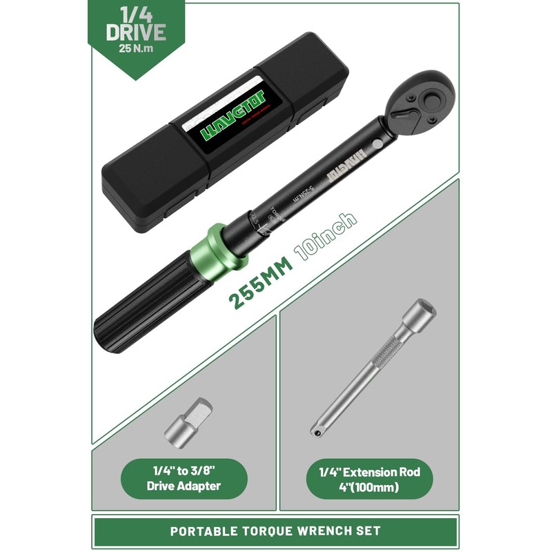LLAVETOR Bicycle Torque Wrench 1/4 Inch, 5-25 Nm Torque Wrench Car Torque Wrench Set 1/4 to 3/8 Adapter, ± 3% Error Accuracy