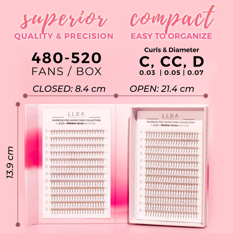 - ✅ VERSATILE & CONVENIENT: These LashFolio Narrow Promade Fans are compatible with LLBA's existing Promade Fans, allowing you to mix and match based on your client's preferences and desired lash look. Both mix lengths and single lengths available provide you with the flexibility to create a customized lash style for each client, while the vegan-friendly and cruelty-free materials allow you to confidently offer your clients stunning lash extensions without compromising your ethical values.