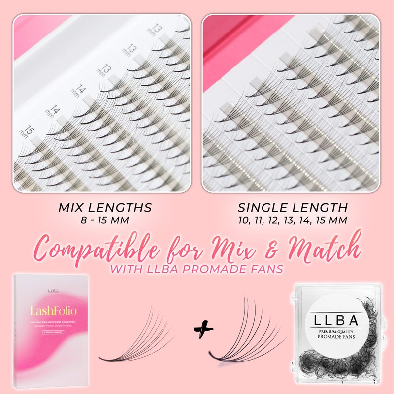 - EFECTO IMPRESIONANTE Y DRAMÁTICO: Los ventiladores Promade LLBA LashFolio cuentan con ventiladores estrechos que crean un efecto llamativo y dramático para las pestañas de tu cliente. Cada abanico está diseñado con ventiladores más cercanos para producir un gran volumen y definición, lo que ayuda a que las pestañas de sus clientes se destaquen con el aspecto de pestañas más atrevido, grueso y denso entre la multitud. Diseñado con tallos más largo
